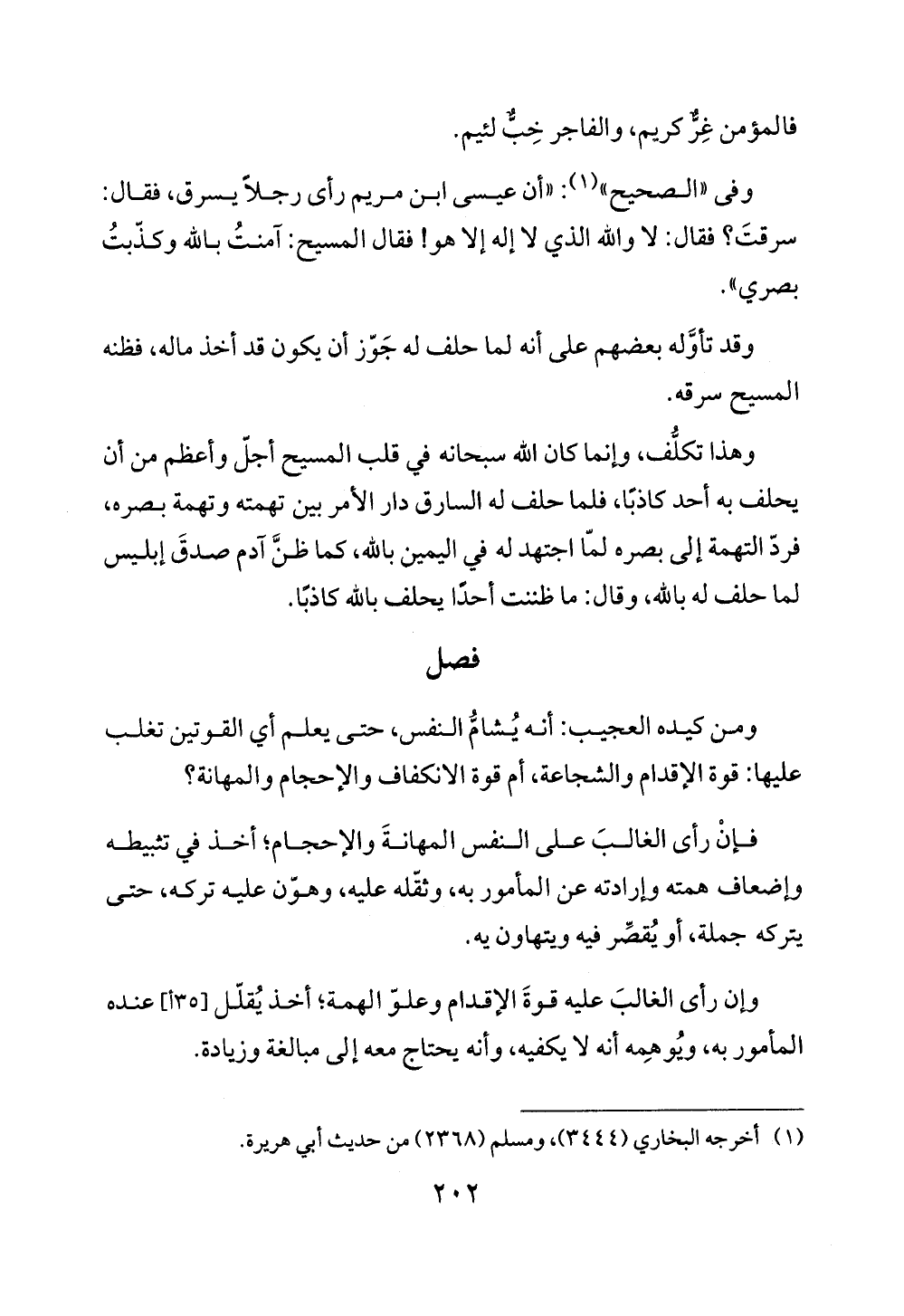 ومن كيده العجيب: أنه يُشامُّ النفس، حتى يعلم أي القوتين تغلب عليها: قوة الإقدام والشجاعة، أم قوة الانكفاف والإحجام والمهانة؟