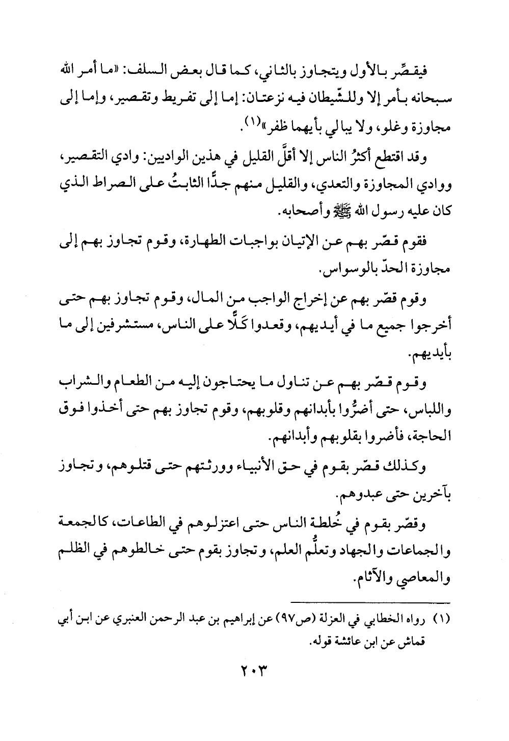 وقد اقتطع أكثرُ الناس إلا أقلَّ القليل في هذين الواديين: وادي التقصير، ووادي المجاوزة والتعدي، والقليل منهم جدًّا الثابتُ على الصراط الذي كان عليه رسول الله - صلى الله عليه وسلم - وأصحابه.
