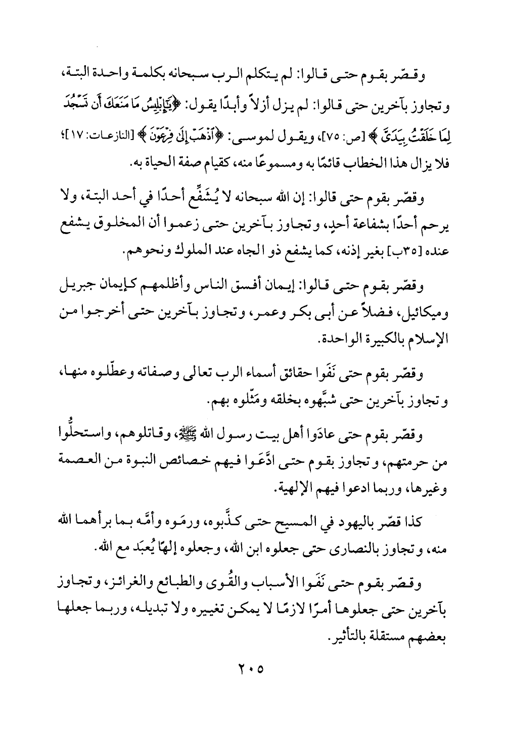 وقصّر بقوم حتى نَفَوا حقائق أسماء الرب تعالى وصفاته وعطّلوه منها، وتجاوز بآخرين حتى شبَّهوه بخلقه ومَثّلوه بهم.