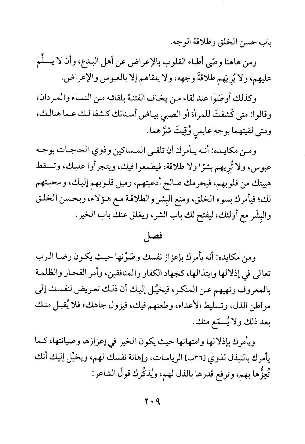 ومن مكايده: أنه يأمرك أن تلقى المساكين وذوي الحاجات بوجه عبوس، ولا تُرِيهم بشرًا ولا طلاقة، فيطمعوا فيك، ويتجرأوا عليك، وتسقط هيبتك من قلوبهم، فيحرمك صالح أدعيتهم، وميل قلوبهم إليك، ومحبتهم لك؛ فيأمرك بسوء الخلق، ومنع البِشر والطلاقة مع هؤلاء، وبحسن الخلق والبِشْر مع أولئك، ليفتح لك باب الشر، ويغلق عنك باب الخير.