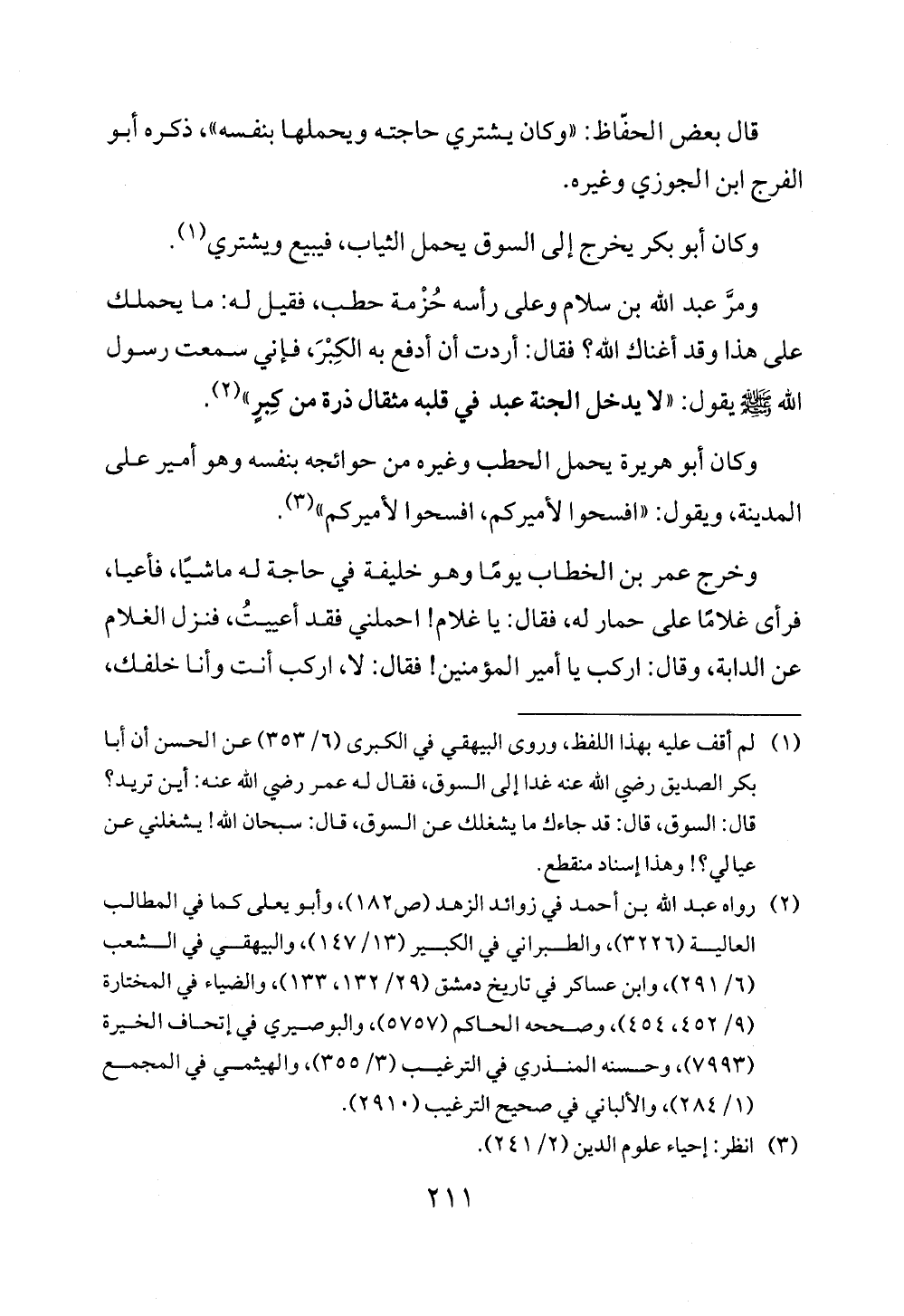 ومرَّ عبد الله بن سلام وعلى رأسه حُزْمة حطب، فقيل له: ما يحملك على هذا وقد أغناك الله؟ فقال: أردت أن أدفع به الكِبْرَ، فإني سمعت رسول الله - صلى الله عليه وسلم - يقول: "لا يدخل الجنة عبد في قلبه مثقال ذرة من كِبرٍ" (¬2).