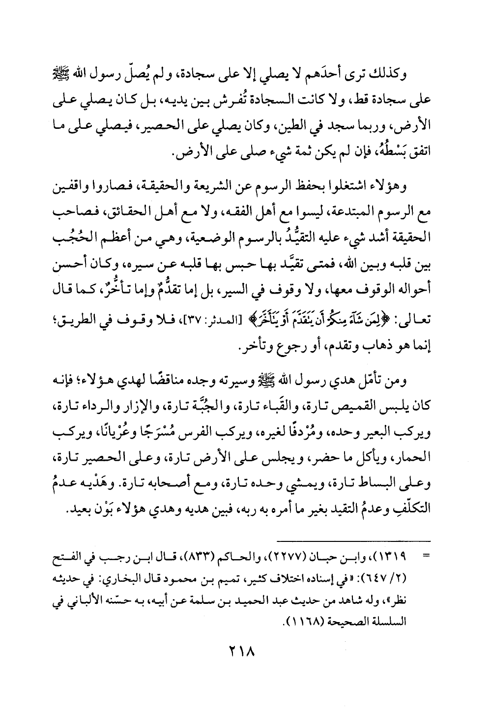 ومن تأمّل هدي رسول الله - صلى الله عليه وسلم - وسيرته وجده مناقضًا لهدي هؤلاء؛ فإنه كان يلبس القميص تارة، والقَباء تارة، والجُبَّة تارة، والإزار والرداء تارة، ويركب البعير وحده، ومُرْدفًا لغيره، ويركب الفرس مُسْرَجًا وعُرْيانًا، ويركب الحمار، ويأكل ما حضر، ويجلس على الأرض تارة، وعلى الحصير تارة، وعلى البساط تارة، ويمشي وحده تارة، ومع أصحابه تارة. وهَدْيه عدمُ التكلّفِ وعدمُ التقيد بغير ما أمره به ربه، فبين هديه وهدي هؤلاء بَوْن بعيد.