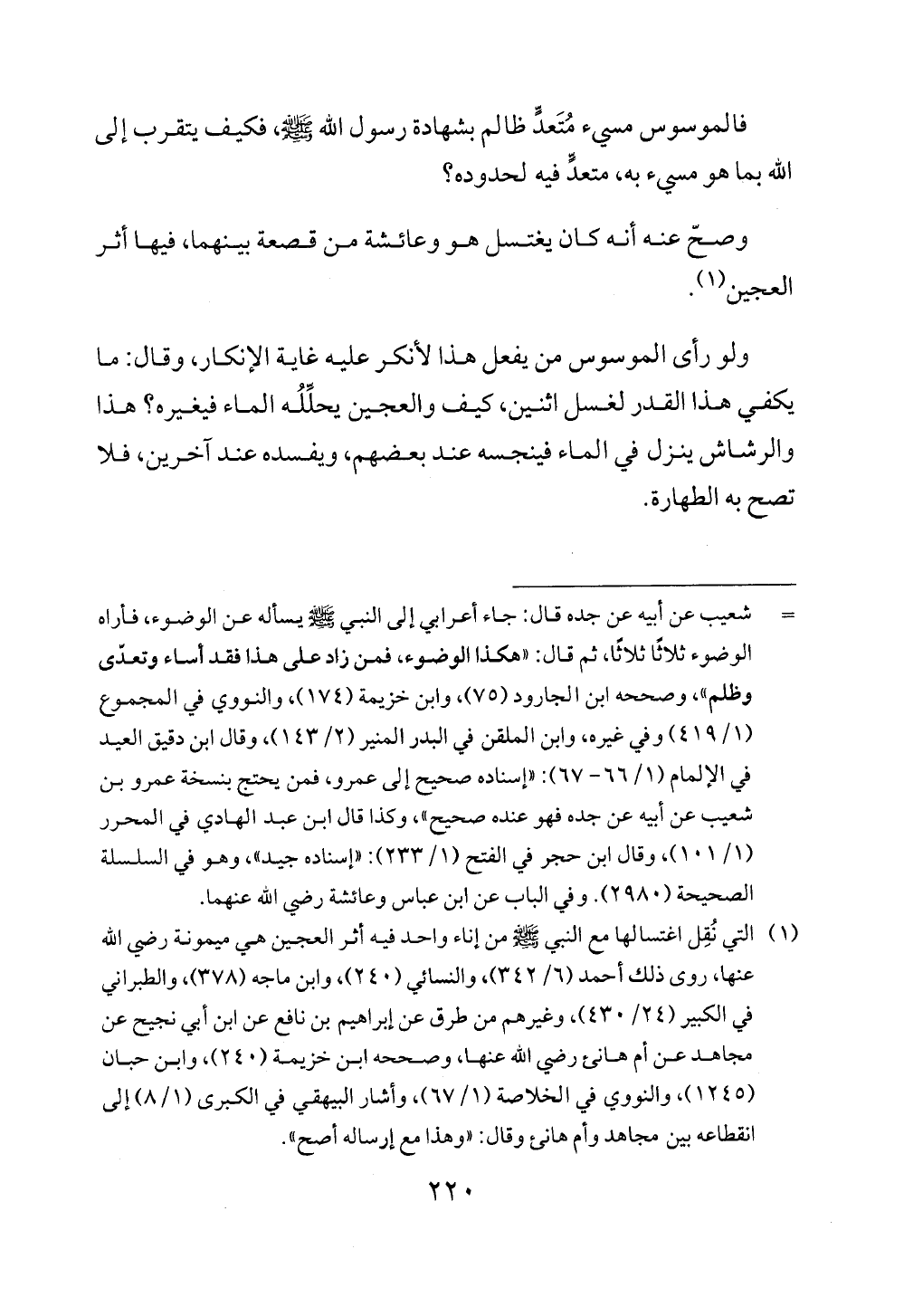 = شعيب عن أبيه عن جده قال: جاء أعرابي إلى النبي - صلى الله عليه وسلم - يسأله عن الوضوء، فأراه الوضوء ثلاثًا ثلاثًا، ثم قال: "هكذا الوضوء، فمن زاد على هذا فقد أساء وتعدّى وظلم"، وصححه ابن الجارود (75)، وابن خزيمة (174)، والنووي في المجموع (1/ 419) وفي غيره، وابن الملقن في البدر المنير (2/ 143)، وقال ابن دقيق العيد في الإلمام (1/ 66 - 67): "إسناده صحيح إلى عمرو، فمن يحتج بنسخة عمرو بن شعيب عن أبيه عن جده فهو عنده صحيح"، وكذا قال ابن عبد الهادي في المحرر (1/ 101)، وقال ابن حجر في الفتح (1/ 233): "إسناده جيد"، وهو في السلسلة الصحيحة (2980). وفي الباب عن ابن عباس وعائشة رضي الله عنهما.