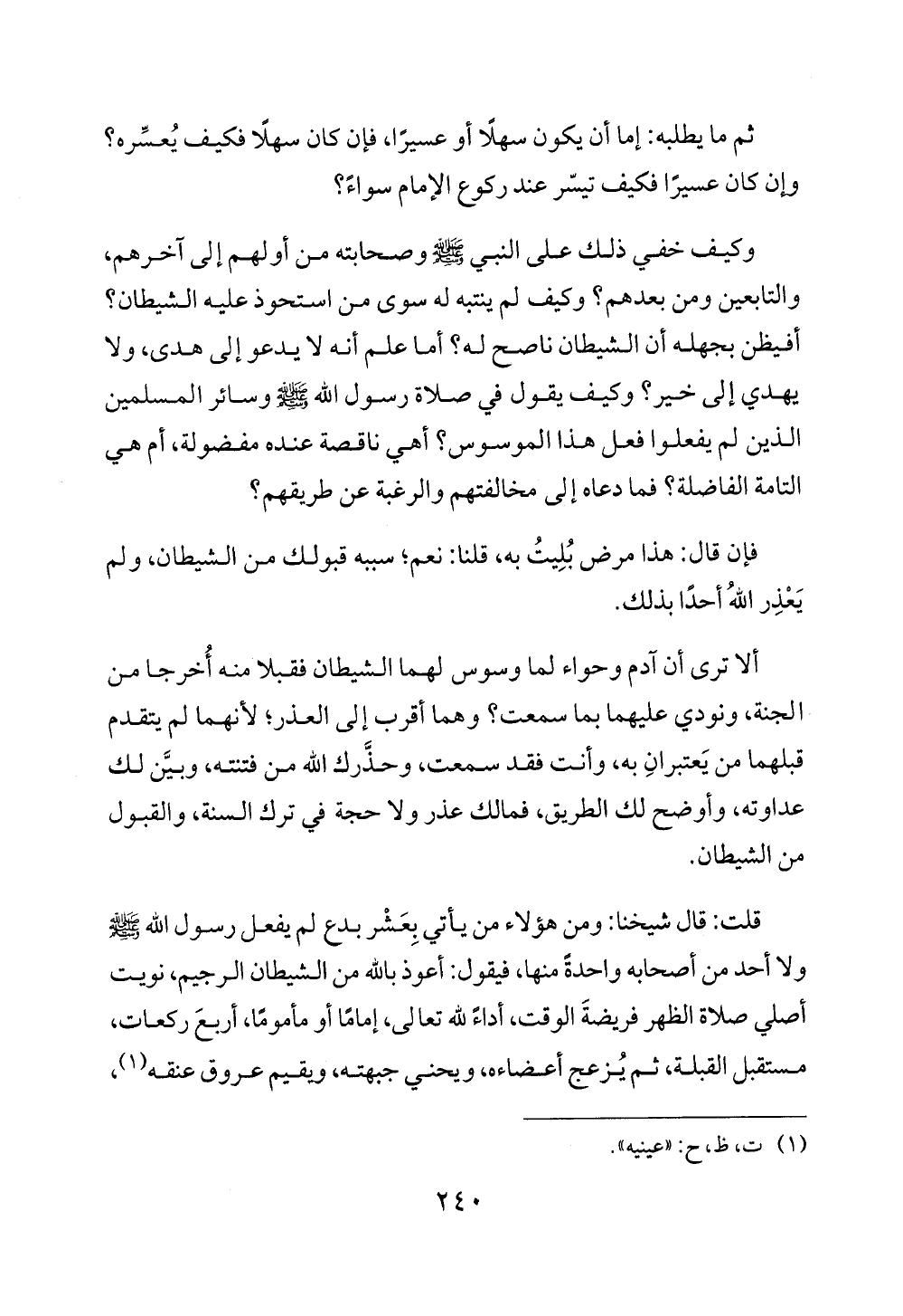 وكيف خفي ذلك على النبي - صلى الله عليه وسلم - وصحابته من أولهم إلى آخرهم، والتابعين ومن بعدهم؟ وكيف لم ينتبه له سوى من استحوذ عليه الشيطان؟ أفيظن بجهله أن الشيطان ناصح له؟ أما علم أنه لا يدعو إلى هدى، ولا يهدي إلي خير؟ وكيف يقول في صلاة رسول الله - صلى الله عليه وسلم - وسائر المسلمين الذين لم يفعلوا فعل هذا الموسوس؟ أهي ناقصة عنده مفضولة، أم هي التامة الفاضلة؟ فما دعاه إلي مخالفتهم والرغبة عن طريقهم؟