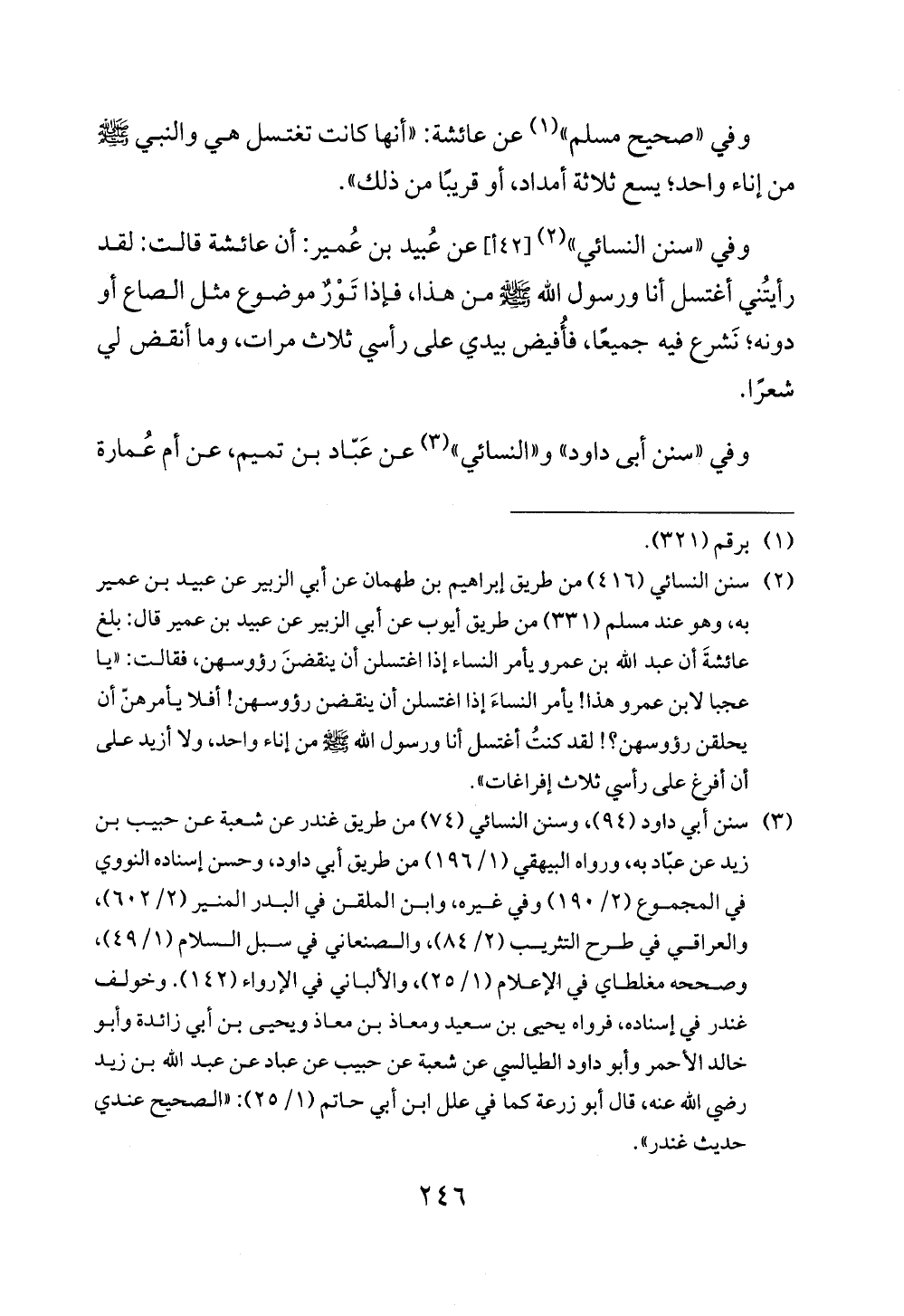 (¬2) سنن النسائي (416) من طريق إبراهيم بن طهمان عن أبي الزبير عن عبيد بن عمير به، وهو عند مسلم (331) من طريق أيوب عن أبي الزبير عن عبيد بن عمير قال: بلغ عائشةَ أن عبد الله بن عمرو يأمر النساء إذا اغتسلن أن ينقضنَ رؤوسهن، فقالت: "يا عجبا لابن عمرو هذا! يأمر النساءَ إذا اغتسلن أن ينقضن رؤوسهن! أفلا يأمرهنّ أن يحلقن رؤوسهن؟! لقد كنتُ أغتسل أنا ورسول الله - صلى الله عليه وسلم - من إناء واحد، ولا أزيد على أن أفرغ على رأسي ثلاث إفراغات".