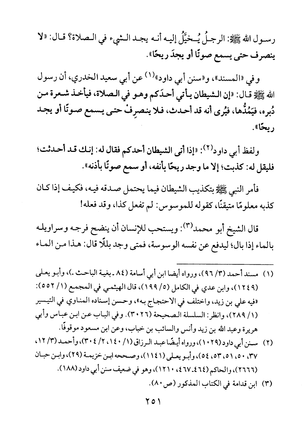 رسول الله - صلى الله عليه وسلم -: الرجلُ يُخيَّلُ إليه أنه يجد الشيء في الصلاة؟ قال: "لا ينصرف حتى يسمع صوتًا أو يجدَ ريحًا".