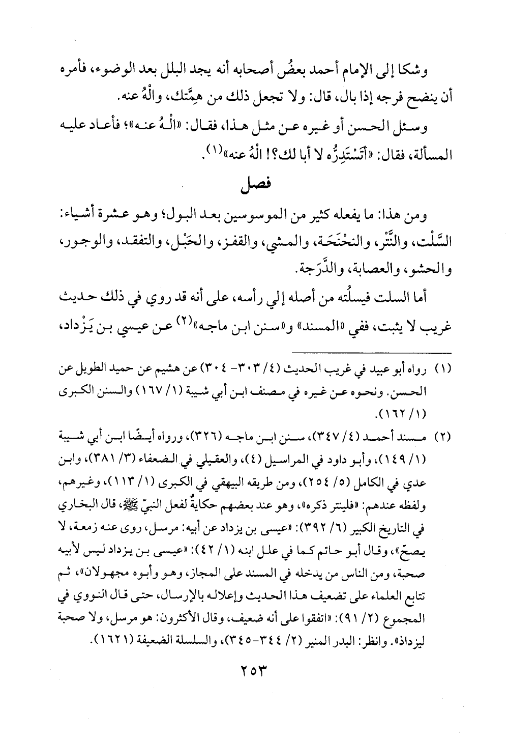(¬2) مسند أحمد (4/ 347)، سنن ابن ماجه (326)، ورواه أيضًا ابن أبي شيبة (1/ 149)، وأبو داود في المراسيل (4)، والعقيلي في الضعفاء (3/ 381)، وابن عدي في الكامل (5/ 254)، ومن طريقه البيهقي في الكبرى (1/ 113)، وغيرهم، ولفظه عندهم: "فلينتر ذكره"، وهو عند بعضهم حكايةٌ لفعل النبيّ - صلى الله عليه وسلم -، قال البخاري في التاريخ الكبير (6/ 392): "عيسى بن يزداد عن أبيه: مرسل، روى عنه زمعة، لا يصحّ"، وقال أبو حاتم كما في علل ابنه (1/ 42): "عيسى بن يزداد ليس لأبيه صحبة، ومن الناس من يدخله في المسند على المجاز، وهو وأبوه مجهولان"، ثم تتابع العلماء على تضعيف هذا الحديث وإعلاله بالإرسال، حتى قال النووي في المجموع (2/ 91): "اتفقوا على أنه ضعيف، وقال الأكثرون: هو مرسل، ولا صحبة ليزداذ". وانظر: البدر المنير (2/ 344 - 345)، والسلسلة الضعيفة (1621).