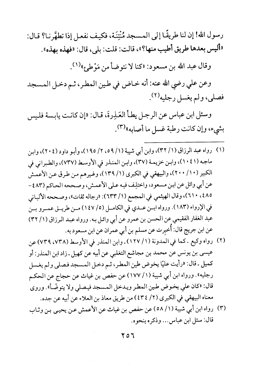 (¬2) رواه وكيع -كما في المدونة (1/ 127) - وابن المنذر في الأوسط (738، 739) عن عيسى بن يونس عن محمد بن مجاشع التغلبي عن أبيه عن كهيل -زاد ابن المنذر: أو كميل- قال: "رأيت عليّا يخوض طين المطر، ثم دخل المسجد فصلى ولم يغسل رجليه". ورواه ابن أبي شيبة (1/ 177) عن حفص بن غياث عن حجاج عن الحكم قال: "كان علي يخوض طين المطر ويدخل المسجد فيصلي ولا يتوضأ". وروى معناه البيهقي في الكبرى (2/ 434) من طريق معاذ بن العلاء عن أبيه عن جده.
