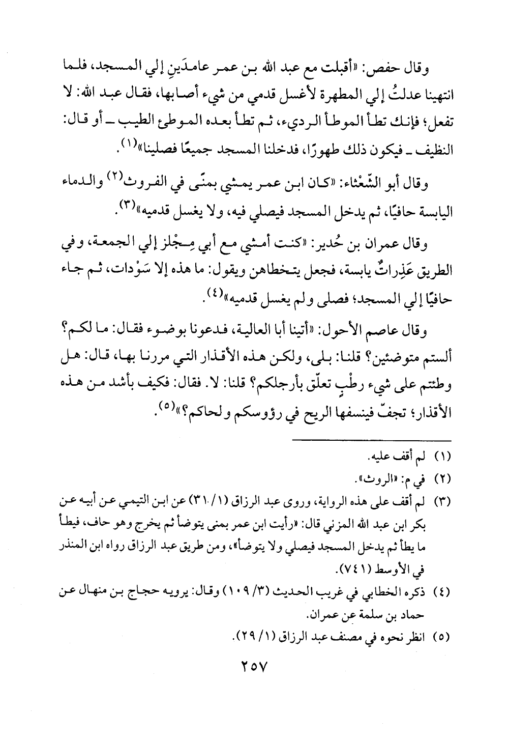 (¬3) لم أقف على هذه الرواية، وروى عبد الرزاق (1/ 31) عن ابن التيمي عن أبيه عن بكر ابن عبد الله المزني قال: "رأيت ابن عمر بمنى يتوضأ ثم يخرج وهو حاف، فيطأ ما يطأ ثم يدخل المسجد فيصلي ولا يتوضأ"، ومن طريق عبد الرزاق رواه ابن المنذر في الأوسط (741).