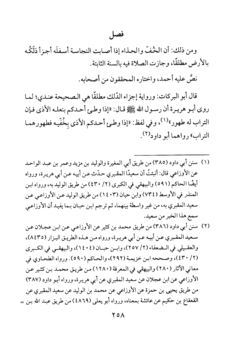 ومن ذلك: أن الخُفّ والحذاء إذا أصابت النجاسة أسفلَه أجزأ دَلْكُه بالأرض مطلقًا، وجازت الصلاة فيه بالسنة الثابتة.