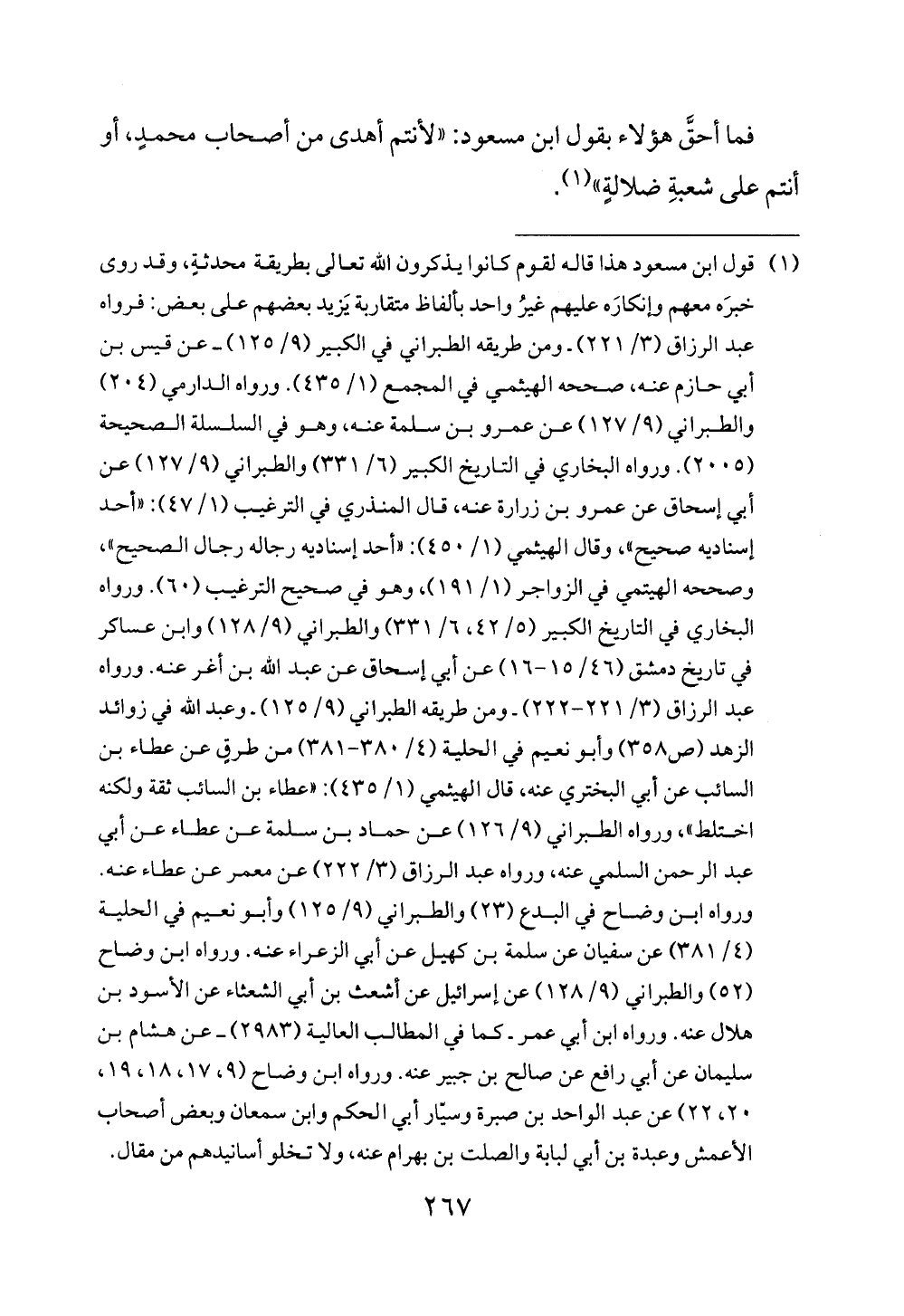 (¬1) قول ابن مسعود هذا قاله لقوم كانوا يذكرون الله تعالى بطريقة محدثةٍ، وقد روى خبرَه معهم وإنكارَه عليهم غيرُ واحد بألفاظ متقاربة يَزيد بعضهم على بعض: فرواه عبد الرزاق (3/ 221) - ومن طريقه الطبراني في الكبير (9/ 125) - عن قيس بن أبي حازم عنه، صححه الهيثمي في المجمع (1/ 435). ورواه الدارمي (204) والطبراني (9/ 127) عن عمرو بن سلمة عنه، وهو في السلسلة الصحيحة (2005). ورواه البخاري في التاريخ الكبير (6/ 331) والطبراني (9/ 127) عن أبي إسحاق عن عمرو بن زرارة عنه، قال المنذري في التركيب (1/ 47): "أحد إسناديه صحيح"، وقال الهيثمي (1/ 450): "أحد إسناديه رجاله رجال الصحيح"، وصححه الهيتمي في الزواجر (1/ 191)، وهو في صحيح الترغيب (60). ورواه البخاري في التاريخ الكبير (5/ 42، 6/ 331) والطبراني (9/ 128) وابن عساكر في تاريخ دمشق (46/ 15 - 16) عن أبي إسحاق عن عبد الله بن أغر عنه. ورواه عبد الرزاق (3/ 221 - 222) - ومن طريقه الطبراني (9/ 125) - وعبد الله في زوائد الزهد (ص 358) وأبو نعيم في الحلية (4/ 380 - ا 38) من طرقٍ عن عطاء بن السائب عن أبي البختري عنه، قال الهيثمي (1/ 435): "عطاء بن السائب ثقة ولكنه اختلط"، ورواه الطبراني (9/ 126) عن حماد بن سلمة عن عطاء عن أبي عبد الرحمن السلمي عنه، ورواه عبد الرزاق (3/ 222) عن معمر عن عطاء عنه. ورواه ابن وضاح في البدع (23) والطبراني (9/ 125) وأبو نعيم في الحلية (4/ 381) عن سفيان عن سلمة بن كهيل عن أبي الزعراء عنه. ورواه ابن وضاح (52) والطبراني (9/ 128) عن إسرائيل عن أشعث بن أبي الشعثاء عن الأسود بن هلال عنه. ورواه ابن أبي عمر -كما في المطالب العالية (2983) - عن هشام بن سليمان عن أبي رافع عن صالح بن جبير عنه. ورواه ابن وضاح (9، 17، 18، 19، 20، 22) عن عبد الواحد بن صبرة وسيّار أبي الحكم وابن سمعان وبعض أصحاب الأعمش وعبدة بن أبي لبابة والصلت بن بهرام عنه، ولا تخلو أسانيدهم من مقال.