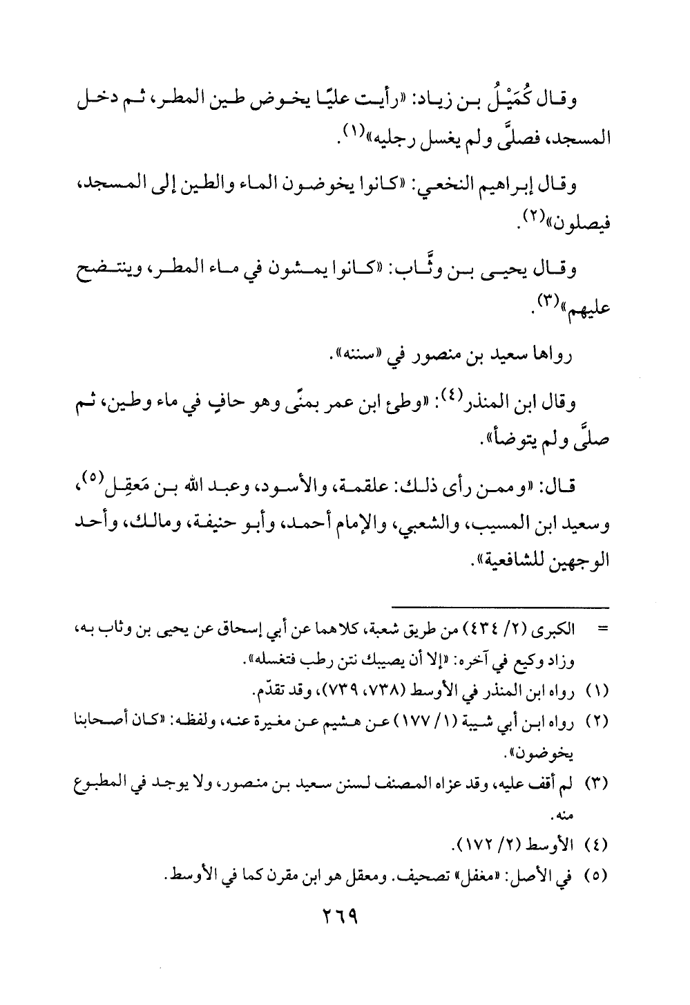 وقال كُمَيْلُ بن زياد: "رأيت عليًا يخوض طين المطر، ثم دخل المسجد، فصلىَّ ولم يغسل رجليه" (¬1).
