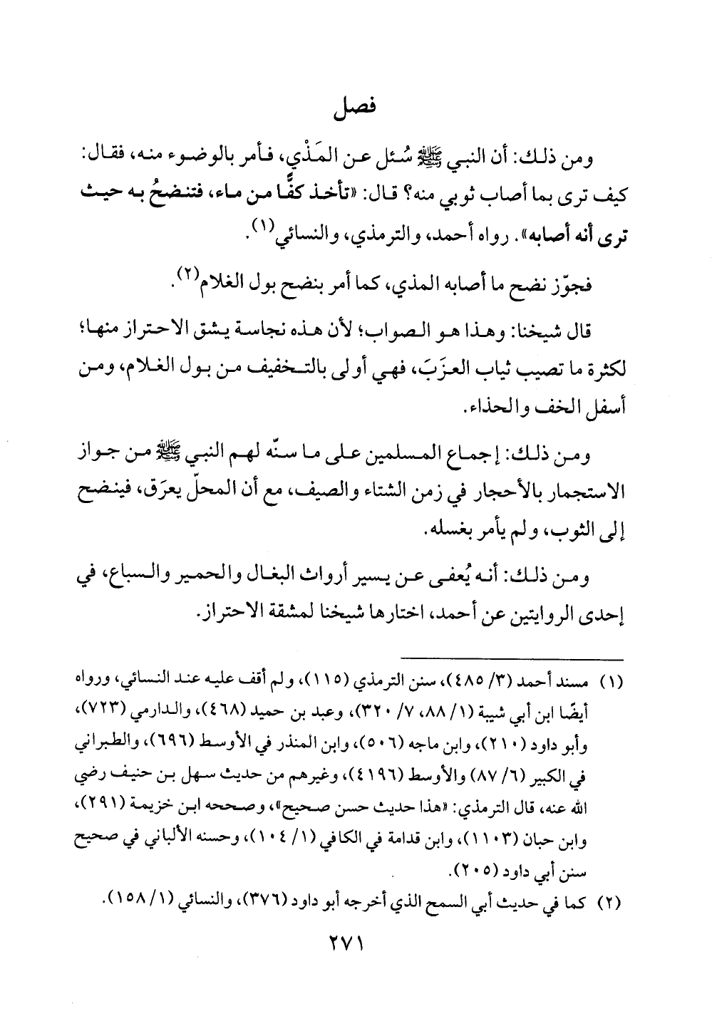 ومن ذلك: أن النبي - صلى الله عليه وسلم - بالوضوء منه، فقال: كيف ترى بما أصاب ثوبي منه؟ قال: "تاْخذ كفًّا من ماء فتنضحُ به حيث ترى أنه أصابه". رواه أحمد، والترمذي، والنسائي (¬1).
