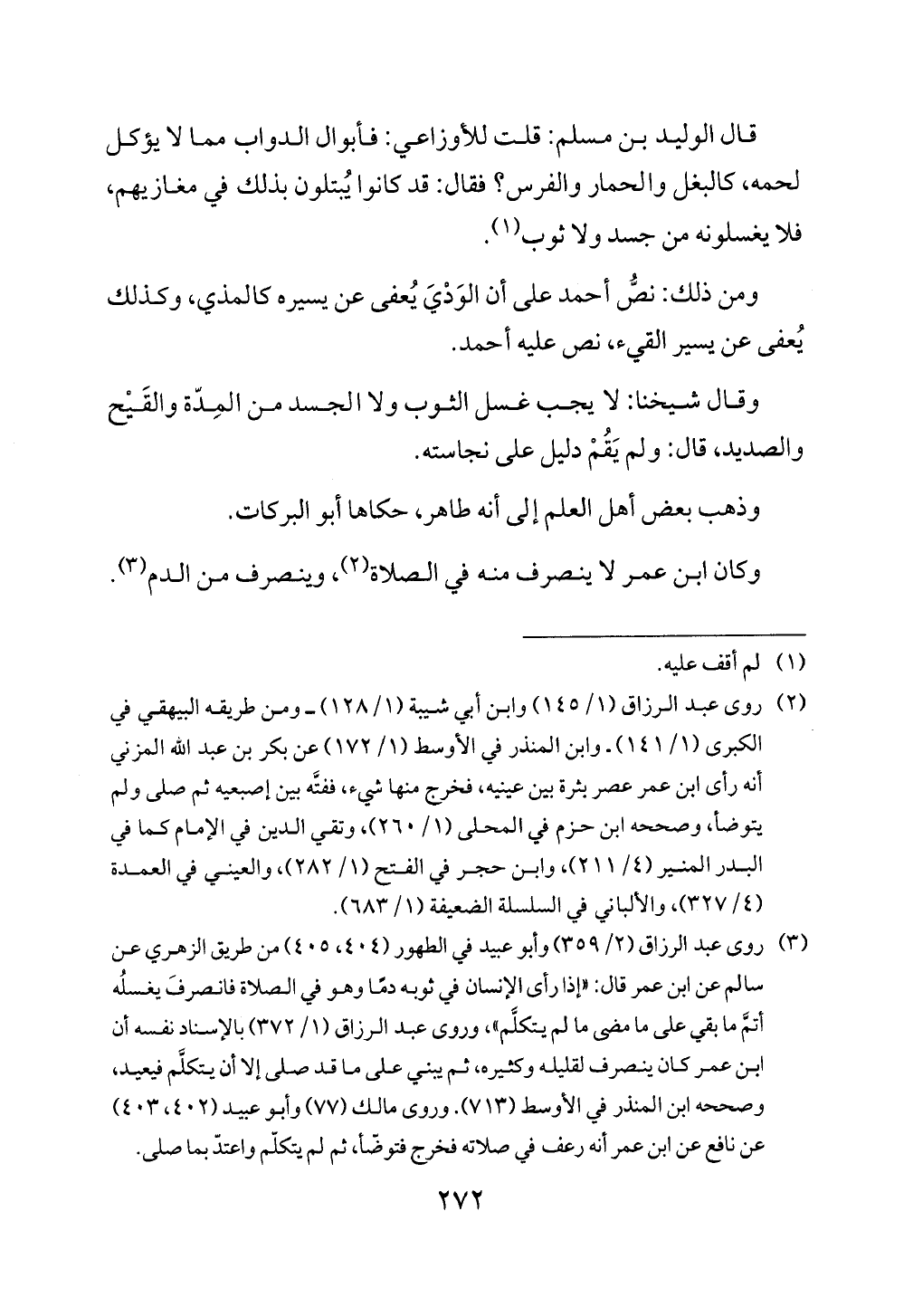 (¬2) روى عبد الرزاق (1/ 145) وابن أبي شيبة (1/ 128) - ومن طريقه البيهقي في الكبرى (1/ 141) - وابن المنذر في الأوسط (1/ 172) عن بكر بن عبد الله المزني أنه رأى ابن عمر عصر بثرة بين عينيه، فخرج منها شيء، ففتَّه بين إصبعيه ثم صلى ولم يتوضأ، وصححه ابن حزم في المحلى (1/ 260)، وتقي الدين في الإمام كما في البدر المنير (4/ 211)، وابن حجر في الفتح (1/ 282)، والعيني في العمدة (4/ 327)، والألباني في السلسلة الضعيفة (1/ 683).