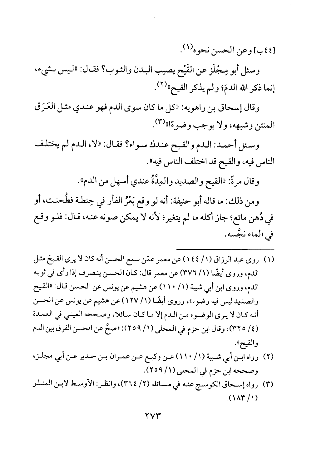 (¬1) روى عبد الرزاق (1/ 144) عن معمر عمّن سمع الحسن أنه كان لا يرى القيحَ مثل الدم، وروى أيضًا (1/ 376) عن معمر قال: كان الحسن ينصرف إذا رأى في ثوبه الدم، وروى ابن أبي شيبة (1/ 110) عن هشيم عن يونس عن الحسن قال: "القيح والصديد ليس فيه وضوء"، وروى أيضًا (1/ 127) عن هشيم عن يونس عن الحسن أنه كان لا يرى الوضوء من الدم إلا ما كان سائلا، وصححه العيني في العمدة (4/ 325)، وقال ابن حزم في المحلى (1/ 259): "صحَّ عن الحسن الفرق بين الدم والقيح".