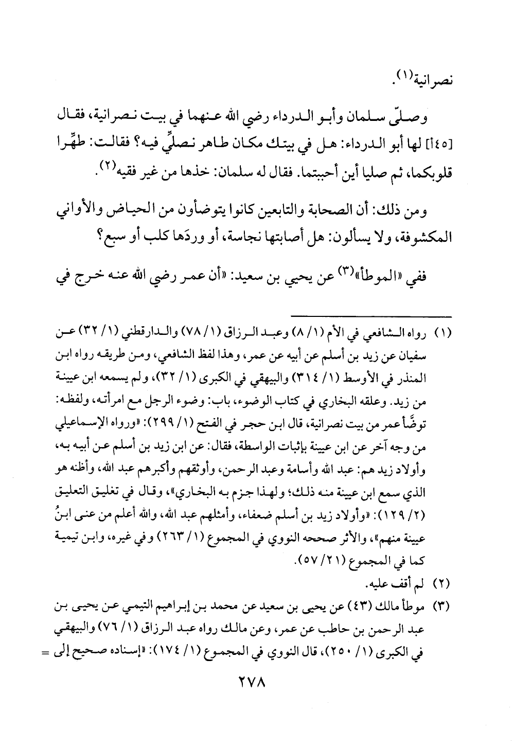 (¬1) رواه الشافعي في الأم (1/ 8) وعبد الرزاق (1/ 78) والدارقطني (1/ 32) عن سفيان عن زيد بن أسلم عن أبيه عن عمر، وهذا لفظ الشافعي، ومن طريقه رواه ابن المنذر في الأوسط (1/ 314) والبيهقي في الكبرى (1/ 32)، ولم يسمعه ابن عيينة من زيد. وعلقه البخاري في كتاب الوضوء، باب: وضوء الرجل مع امرأته، ولفظه: توضَأ عمر من بيت نصرانية، قال ابن حجر في الفتح (1/ 299): "ورواه الإسماعيلي من وجه آخر عن ابن عيينة بإثبات الواسطة، فقال: عن ابن زيد بن أسلم عن أبيه به، وأولاد زيد هم: عبد الله وأسامة وعبد الرحمن، وأوثقهم وأكبرهم عبد الله، وأظنه هو الذي سمع ابن عيينة منه ذلك؛ ولهذا جزم به البخاري"، وقال في تغليق التعليق (2/ 129): "وأولاد زيد بن أسلم ضعفاء، وأمثلهم عبد الله، والله أعلم من عنى ابنُ عيينة منهم"، والأثر صححه النووي في المجموع (1/ 263) وفي غيره، وابن تيمية كما في المجموع (57/ 21).