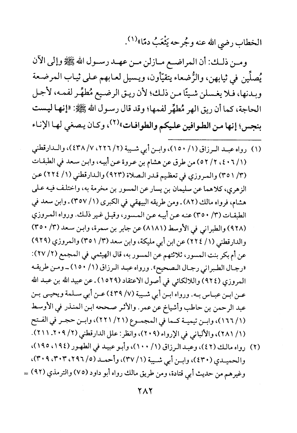 (¬1) رواه عبد الرزاق (1/ 150)، وابن أبي شيبة (2/ 226، 7/ 438)، والدارقطني (1/ 406، 2/ 52) من طرق عن هشام بن عروة عن أبيه، وابن سعد في الطبقات (3/ 351) والمروزي في تعظيم قدر الصلاة (923) والدارقطني (1/ 224) عن الزهري، كلاهما عن سليمان بن يسار عن المسور بن مخرمة به، واختلف فيه على هشام، فرواه مالك (82) - ومن طريقه البيهقي في الكبرى (1/ 357) - وابن سعد في الطبقات (3/ 350) عنه عن أبيه عن المسور، وقيل غير ذلك. ورواه المروزي (928) والطبراني في الأوسط (8181) عن جابر بن سمرة، وابن سعد (3/ 350) والدارقطني (1/ 224) عن ابن أبي مليكة، وابن سعد (3/ 351) والمروزي (929) عن أم بكر بنت المسور، ثلاثتهم عن المسور به، قال الهيثمي في المجمع (2/ 27): "رجال الطبراني رجال الصحيح". ورواه عبد الرزاق (1/ 150) - ومن طريقه المروزي (924) واللالكائي في أصول الاعتقاد (1529) - عن عيد الله بن عبد الله عن ابن عباس به. ورواه ابن أبي شيبة (7/ 439) عن أبي سلمة ويحيى بن عبد الرحمن بن حاطب وأشياخ عن عمر. والأثر صححه ابن المنذر في الأوسط (1/ 166)، وابن تيمية كما في المجموع (21/ 221)، وابن حجر في الفتح (1/ 281)، والألباني في الإرواء (209)، وانظر: علل الدارقطني (2/ 209 - 211).