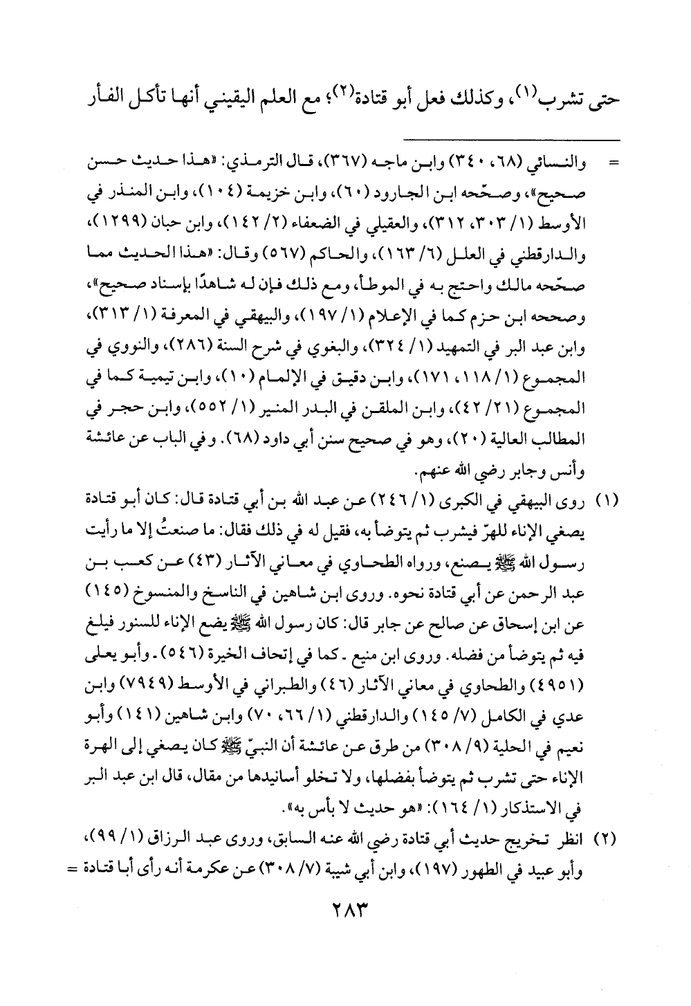 حتى تشرب (¬1)، وكذلك فعل أبو قتادة (¬2)؛ مع العلم اليقيني أنها تأكل الفأر