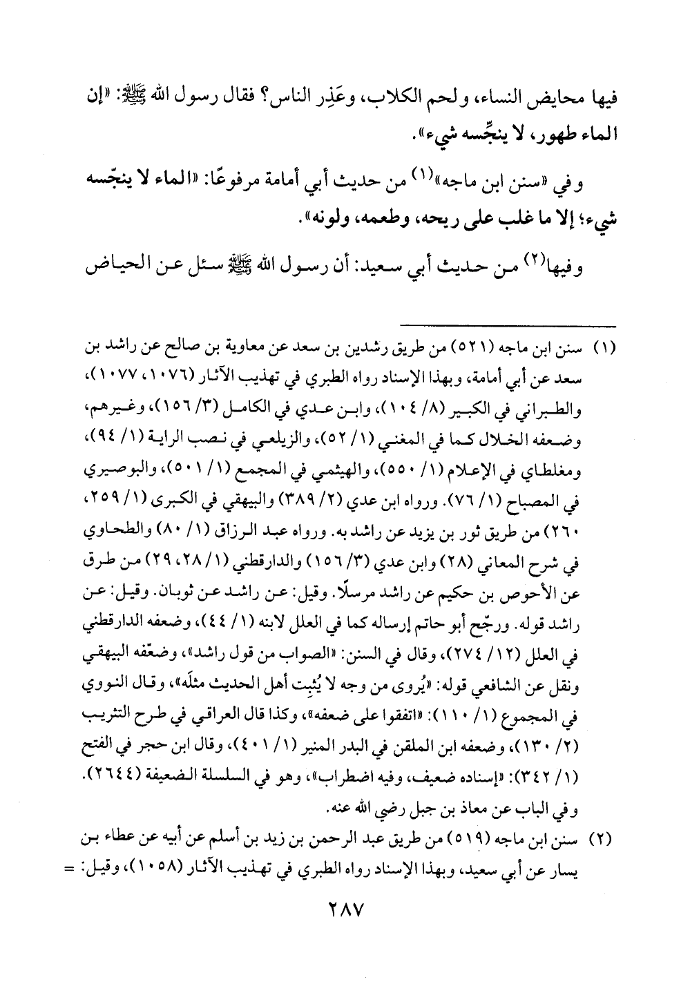 (¬1) سنن ابن ماجه (521) من طريق رشدين بن سعد عن معاوية بن صالح عن راشد بن سعد عن أبي أمامة، وبهذا الإسناد رواه الطبري في تهذيب الآثار (1576، 1077)، والطبراني في الكبير (8/ 104)، وابن عدي في الكامل (3/ 156)، وغيرهم، وضعفه الخلال كما في المغني (1/ 52)، والزيلعي في نصب الراية (1/ 94)، ومغلطاي في الإعلام (1/ 550)، والهيثمي في المجمع (1/ 501)، والبوصيري في المصباح (1/ 76). ورواه ابن عدي (2/ 389) والبيهقي في الكبرى (1/ 259، 260) من طريق ثور بن يزيد عن راشد به. ورواه عبد الرزاق (1/ 80) والطحاوي في شرح المعاني (28) وابن عدي (3/ 156) والدارقطني (1/ 28، 29) من طرق عن الأحوص بن حكيم عن راشد مرسلًا. وقيل: عن راشد عن ثوبان. وقيل: عن راشد قوله. ورجّح أبو حاتم إرساله كما في العلل لابنه (1/ 44)، وضعفه الدارقطني في العلل (12/ 274)، وقال في السنن: "الصواب من قول راشد"، وضغفه البيهقي ونقل عن الشافعي قوله: "يُروى من وجه لا يُثبِت أهل الحديث مثلَه" وقال النووي في المجموع (1/ 110): 9 اتفقوا على ضعفه"، وكذا قال العراقي في طرح التثريب (2/ 130)، وضعفه ابن الملقن في البدر المنير (1/ 401)، وقال ابن حجر في الفتح (1/ 342): "إسناده ضعيف، وفيه اضطراب"، وهو في السلسلة الضعيفة (2644). وفي الباب عن معاذ بن جبل رضي الله عنه.