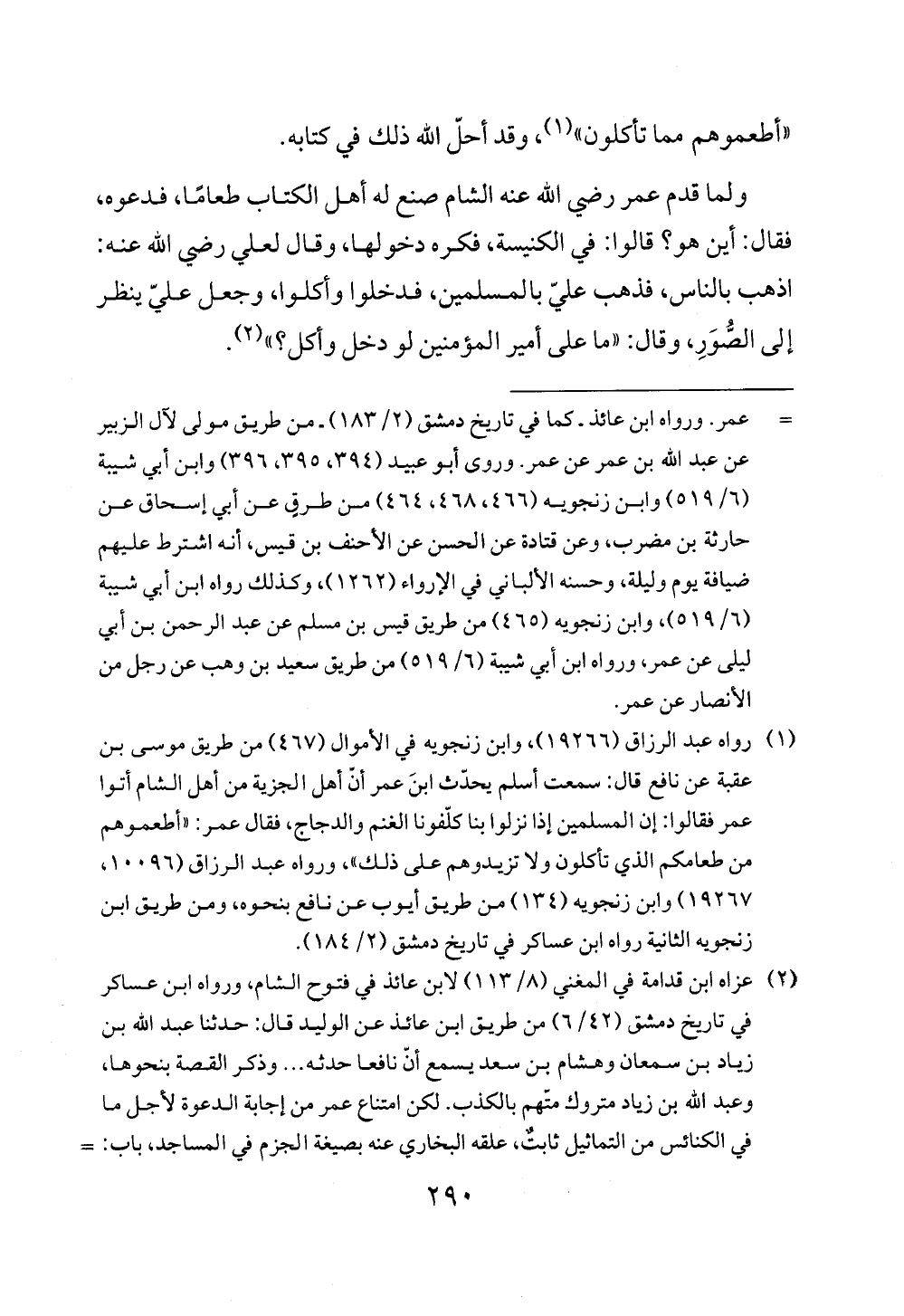 (¬1) رواه عبد الرزاق (19266)، وابن زنجويه في الأموال (467) من طريق موسى بن عقبة عن نافع قال: سمعت أسلم يحدّث ابنَ عمر أن أهل الجزية من أهل الشام أتوا عمر فقالوا: إن المسلمين إذا نزلوا بنا كلّفونا الغنم والدجاج، فقال عمر: "أطعموهم من طعامكم الذي تأكلون ولا تزيدوهم على ذلك"، ورواه عبد الرزاق (10096، 19267) وابن زنجويه (134) من طريق أيوب عن نافع بنحوه، ومن طريق ابن زنجويه الثانية رواه ابن عساكر في تاريخ دمشق (2/ 184).