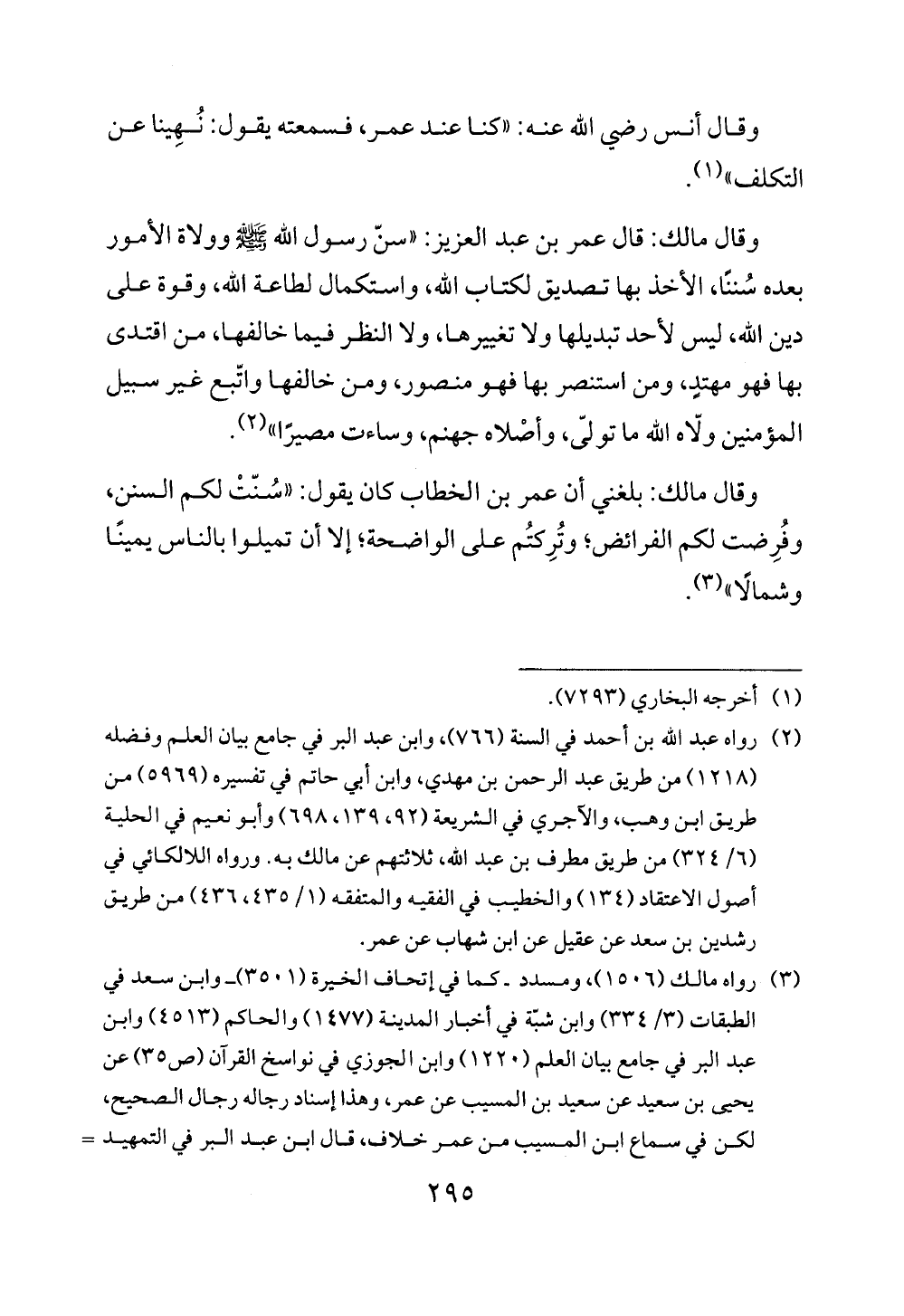 (¬2) رواه عبد الله بن أحمد في السنة (766)، وابن عبد البر في جامع بيان العلم وفضله (1218) من طريق عبد الرحمن بن مهدي، وابن أبي حاتم في تفسيره (5969) من طريق ابن وهب، والآجري في الشريعة (92، 139، 698) وأبو نعيم في الحلية (6/ 324) من طريق مطرف بن عبد الله، ثلاثتهم عن مالك به. ورواه اللالكائي في أصول الاعتقاد (134) والخطيب في الفقيه والمتفقه (1/ 435، 436) من طريق رشدين بن سعد عن عقيل عن ابن شهاب عن عمر.