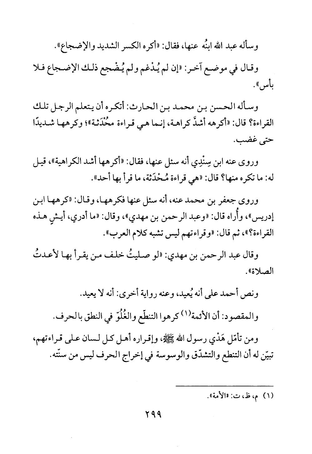 وروى جعفر بن محمد عنه، أنه سئل عنها فكرهها، وقال: "كرهها ابن إدريس"، وأُراه قال: "وعبد الرحمن بن مهدي"، وقال: "ما أدري، أيشٍ هذه القراءة؟ "، ثم قال: "وقراءتهم ليس تشبه كلام العرب".