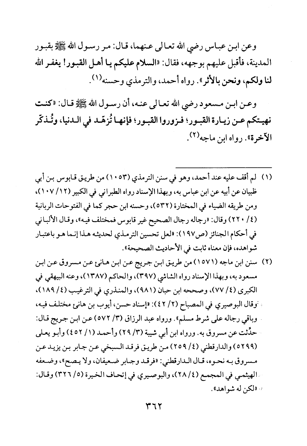 وعن ابن مسعود رضي الله تعالى عنه، أن رسول الله - صلى الله عليه وسلم - قال: "كنت نهيتكم عن زيارة القبور؛ فزوروا القبور؛ فإنها تُزهّد في الدنيا، وتُذكّر الآخرة". رواه ابن ماجه (¬2).