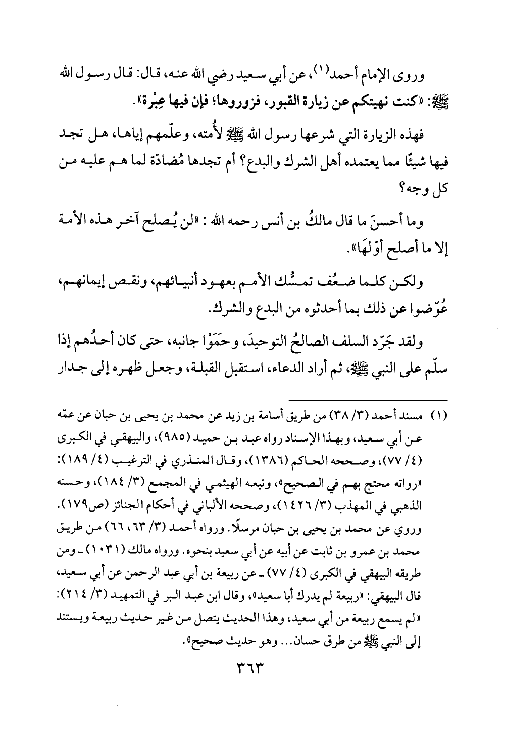 ولقد جَرّد السلف الصالحُ التوحيدَ، وحَمَوْا جانبه، حتى كان أحدُهم إذا سلّم على النبي - صلى الله عليه وسلم -، ثم أراد الدعاء، استقبل القبلة، وجعل ظهره إلى جدار