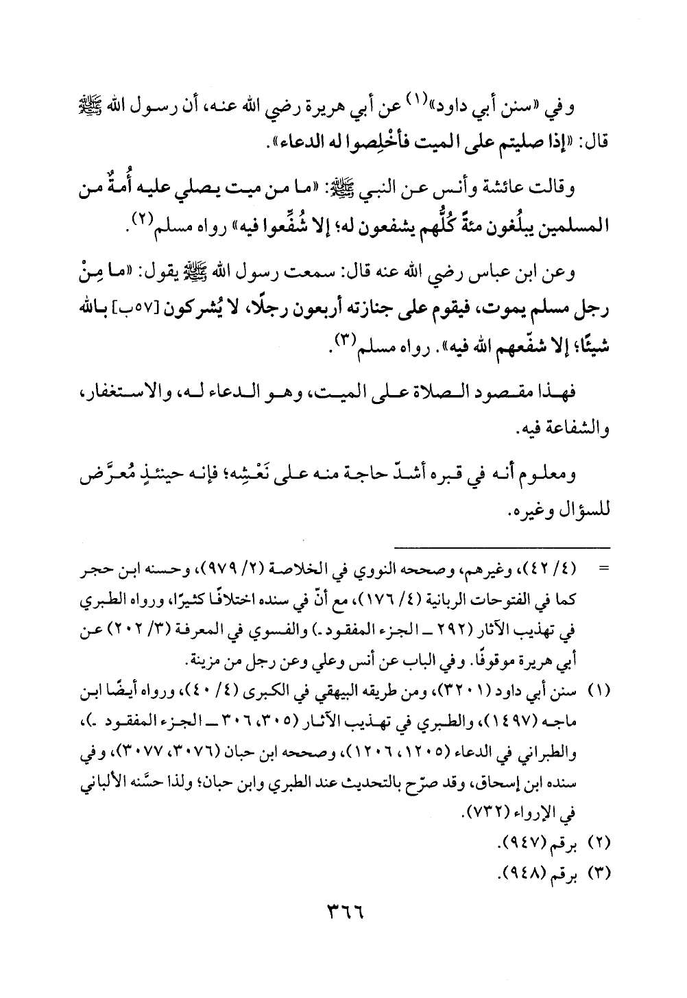 وقالت عائشة وأنس عن النبي - صلى الله عليه وسلم -: "ما من ميت يصلي عليه أُمةٌ من المسلمين يبلُغون مئةً كُلُّهم يشفعون له؛ إلا شُفِّعوا فيه" رواه مسلم (¬2).