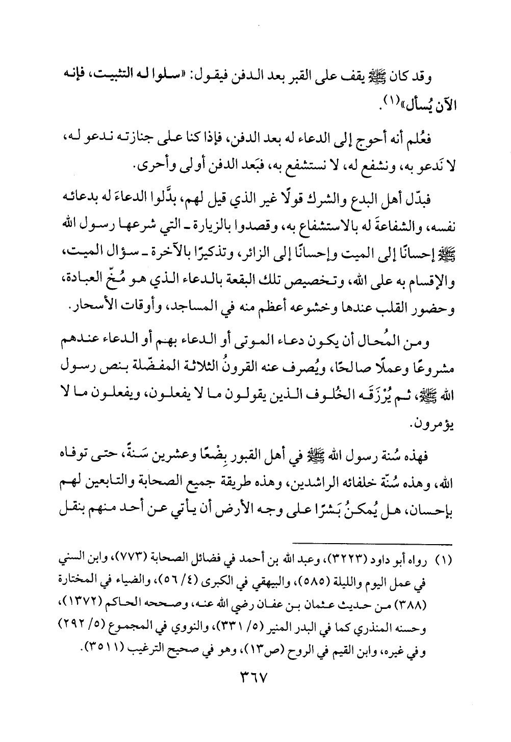 فهذه سُنة رسول الله - صلى الله عليه وسلم - في أهل القبور بِضْعًا وعشرين سَنةً، حتى توفاه الله، وهذه سُنّة خلفائه الراشدين، وهذه طريقة جميع الصحابة والتابعين لهم بإحسان، هل يُمكنُ بَشرًا على وجه الأرض أن يأتي عن أحد منهم بنقل