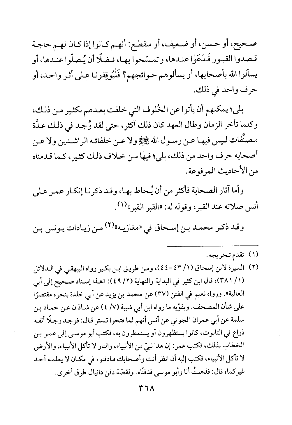 (¬2) السيرة لابن إسحاق (1/ 43 - 44)، ومن طريق ابن بكير رواه البيهقي في الدلائل (1/ 381)، قال ابن كثير في البداية والنهاية (2/ 49): "هذا إسناد صحيح إلى أبي العالية". ورواه نعيم في الفتن (37) عن محمد بن يزيد عن أبي خلدة بنحوه مقتصرًا على شأن المصحف. ويقوّيه ما رواه ابن أبي شيبة (7/ 4) عن شاذان عن حماد بن سلمة عن أبي عمران الجوني عن أنس أنهم لما فتحوا تستر قال: فوجد رجلاً أنفه ذراع في التابوت، كانوا يستظهرون أو يستمطرون به، فكتب أبو موسى إلى عمر بن الخطاب بذلك، فكتب عمر: إن هذا نبيّ من الأنبياء، والنار لا تأكل الأنبياء، والأرض لا تأكل الأنبياء، فكتب إليه أن انظر أنت وأصحابك فادفنوه في مكان لا يعلمه أحد غيركما، قال: فذهبتُ أنا وأبو موسى فدفنّاه. ولقصّة دفن دانيال طرق أخرى.