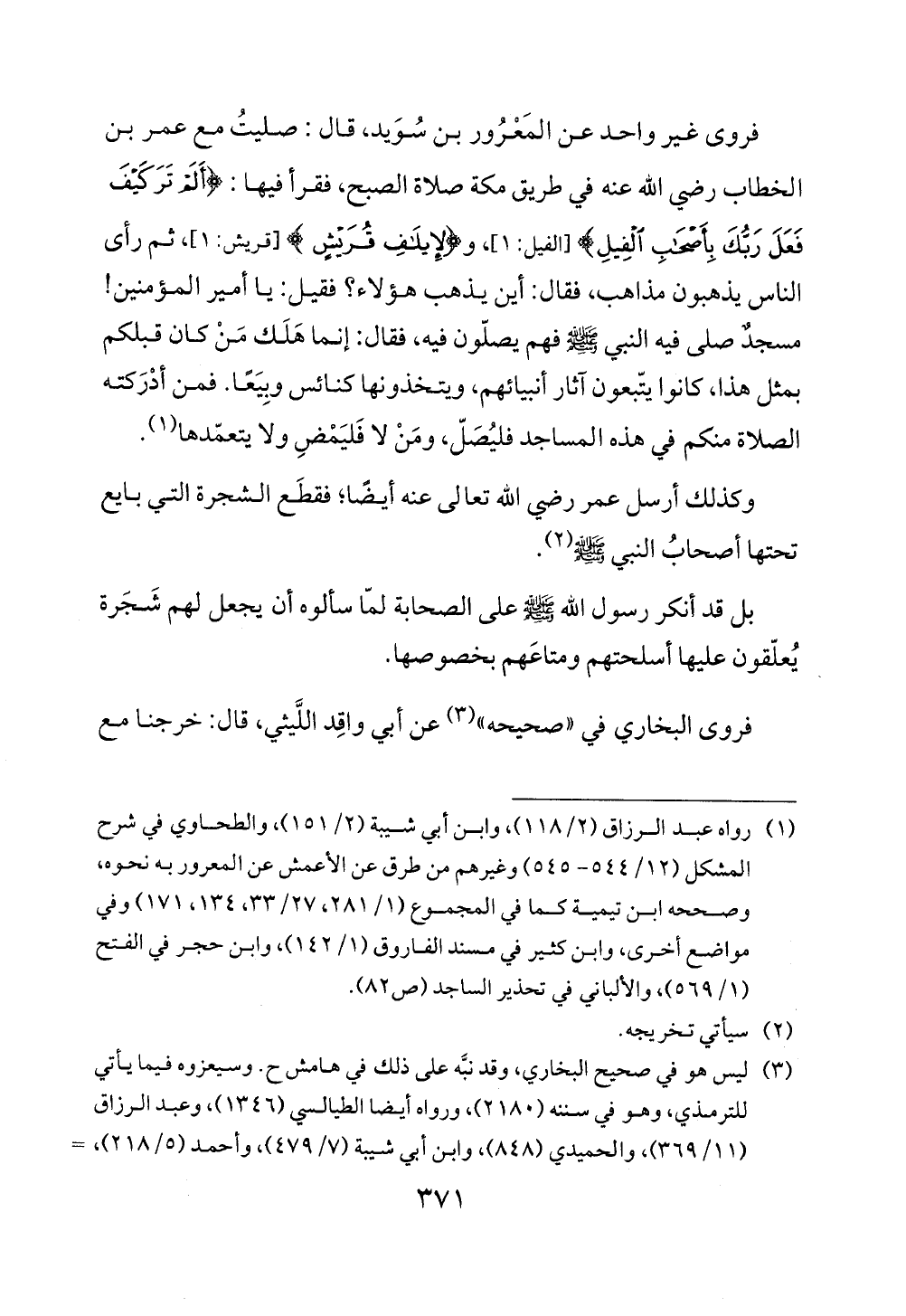 فروى غير واحد عن المَعْرُور بن سُوَيد، قال: صليتُ مع عمر بن الخطاب رضي الله عنه في طريق مكة صلاة الصبح، فقرأ فيها: {أَلَمْ تَرَ كَيْفَ فَعَلَ رَبُّكَ بِأَصْحَابِ الْفِيلِ} [الفيل: 1]، و {لِإِيلَافِ قُرَيْشٍ} [قريش: 1]، ثم رأى الناس يذهبون مذاهب، فقال: أين يذهب هؤلاء؟ فقيل: يا أمير المؤمنين! مسجدٌ صلى فيه النبي - صلى الله عليه وسلم - فهم يصلّون فيه، فقال: إنما هَلَك مَنْ كان قبلكم بمثل هذا، كانوا يتّبعون آثار أنبيائهم، ويتخذونها كنائس وبِيَعًا. فمن أدْرَكته الصلاة منكم في هذه المساجد فليُصَلّ، ومَنْ لا فَليَمْضِ ولا يتعمّدها (¬1).