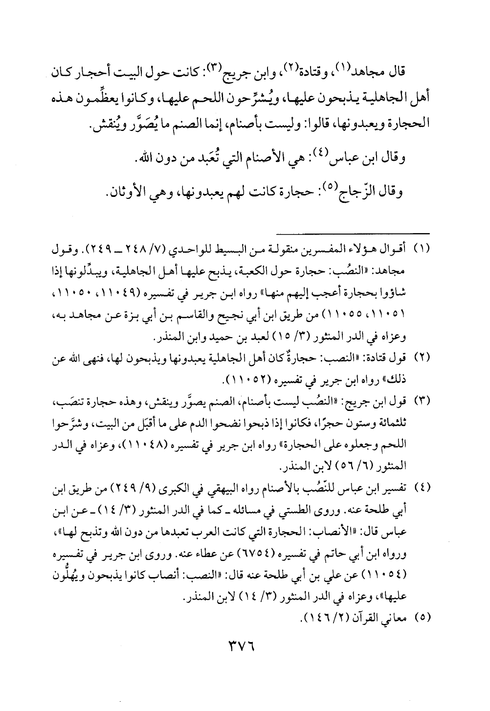 (¬3) قول ابن جريج: "النصُب ليست بأصنام، الصنم يصوَّر وينقش، وهذه حجارة تنصَب، ثلثمائة وستون حجرًا، فكانوا إذا ذبحوا نضحوا الدم على ما أقبَل من البيت، وشرَّحوا اللحم وجعلوه على الحجارة" رواه ابن جرير في تفسيره (11048)، وعزاه في الدر المنثور (6/ 56) لابن المنذر.
