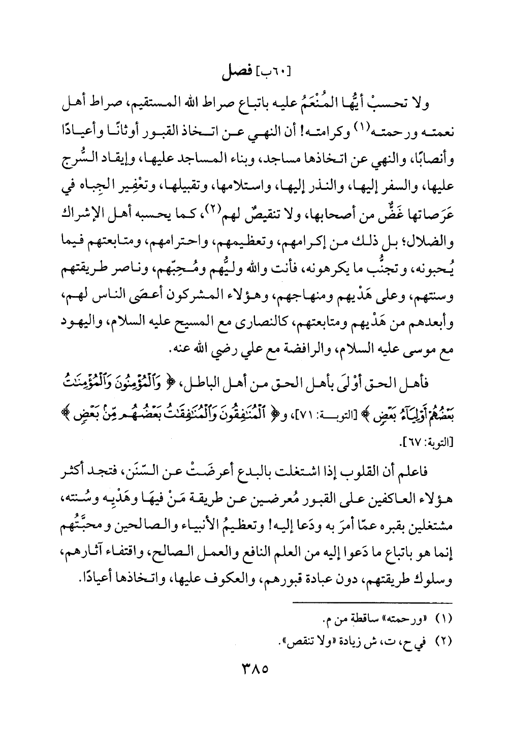 ولا تحسبْ أيّهُا المُنْعَمُ عليه باتباع صراط الله المستقيم، صراط أهل نعمته ورحمته (¬1) وكرامته! أن النهي عن اتخاذ القبور أوثانًا وأعيادًا وأنصابًا، والنهي عن اتخاذها مساجد، وبناء المساجد عليها، وإيقاد السُّرج عليها، والسفر إليها، والنذر إليها، واستلامها، وتقبيلها، وتعْفِير الجِباه في عَرَصاتها غَضٌّ من أصحابها، ولا تنقيصٌ لهم (¬2)، كما يحسبه أهل الإشراك والضلال؛ بل ذلك من إكرامهم، وتعظيمهم، واحترامهم، ومتابعتهم فيما يُحبونه، وتجنُّب ما يكرهونه، فأنت والله وليُّهم ومُحِبّهم، وناصر طريقتهم وسنتهم، وعلى هَدْيهم ومنهاجهم، وهؤلاء المشركون أعصَى الناس لهم، وأبعدهم من هَدْيهم ومتابعتهم، كالنصارى مع المسيح عليه السلام، واليهود