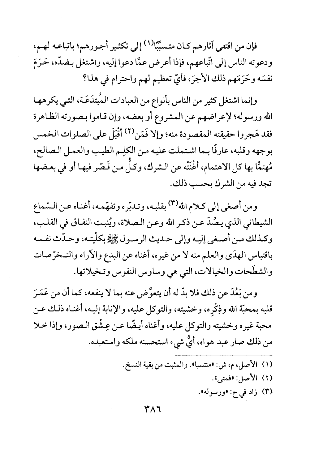 ومن أصغى إلى كلام الله (¬3) بقلبه، وتدبّره وتفهّمه، أغناه عن السّماع الشيطاني الذي يصُدّ عن ذكر الله وعن الصلاة، ويُنبت النفاق في القلب، وكذلك من أصغى إليه وإلى حديث الرسول - صلى الله عليه وسلم - بكلّيته، وحدّث نفسه باقتباس الهدَى والعلم منه لا من غيره، أغناه عن البدع والآراء والتخرّصات والشطَحات والخيالات، التي هي وساوس النفوس وتخيلاتها.