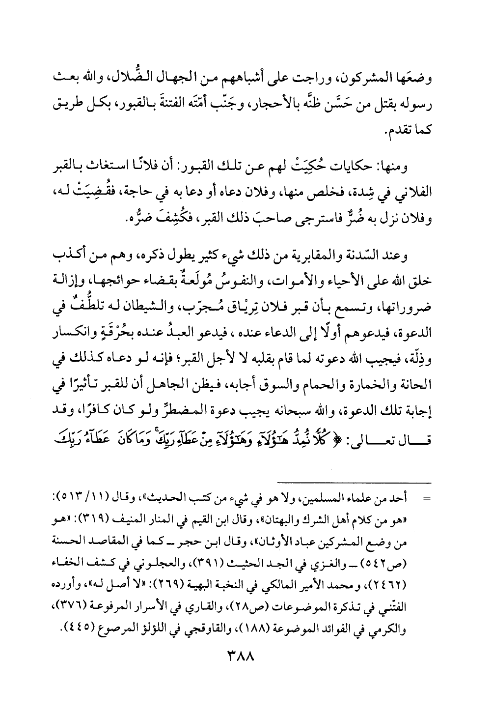 وعند السّدنة والمقابرية من ذلك شيء كثير يطول ذكره، وهم من أكذب خلق الله على الأحياء والأموات، والنفوسُ مُولَعةٌ بقضاء حوائجها، وإزالة ضروراتها، وتسمع بأن قبر فلان تِريْاق مُجرّب، والشيطان له تلطُّفٌ في الدعوة، فيدعوهم أولاً إلى الدعاء عنده، فيدعو العبدُ عنده بحُرْقَةٍ وانكسار وذِلّة، فيجيب الله دعوته لما قام بقلبه لا لأجل القبر، فإنه لو دعاه كذلك في الحانة والخمارة والحمام والسوق أجابه، فيظن الجاهل أن للقبر تأثيرًا في إجابة تلك الدعوة، والله سبحانه يجيب دعوة المضطرِّ ولو كان كافرًا، وقد قال تعالى: {كُلًّا نُمِدُّ هَؤُلَاءِ وَهَؤُلَاءِ مِنْ عَطَاءِ رَبِّكَ وَمَا كَانَ عَطَاءُ رَبِّكَ