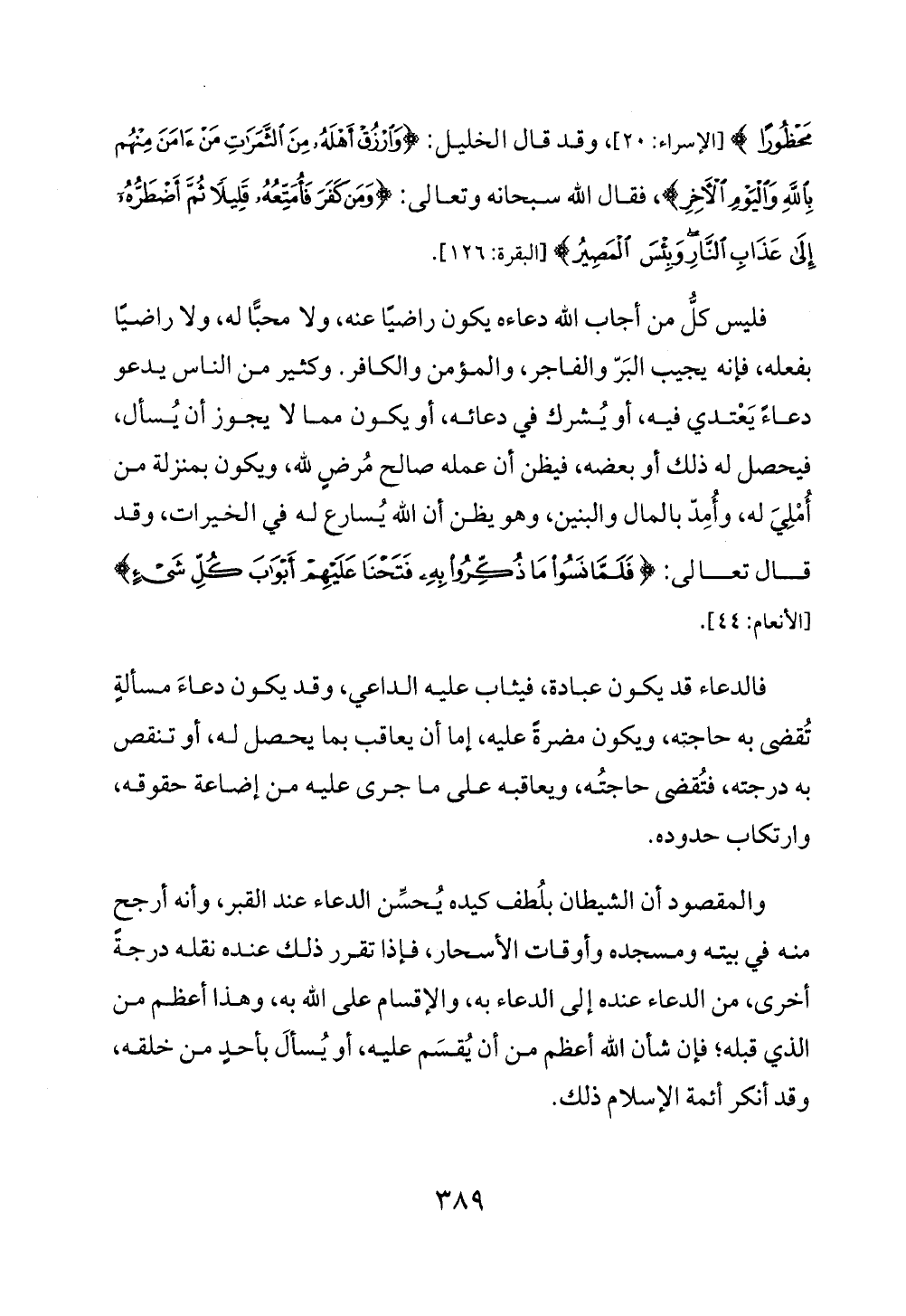 فليس كلُّ من أجاب الله دعاءه يكون راضيًا عنه، ولا محبًّا له، ولا راضيًا بفعله، فإنه يجيب البَرَّ والفاجر، والمؤمن والكافر. وكثير من الناس يدعو دعاءً يَعْتدي فيه، أو يُشرك في دعائه، أو يكون مما لا يجوز أن يُسأل، فيحصل له ذلك أو بعضه، فيظن أن عمله صالح مُرضٍ لله، ويكون بمنزلة من أُمْلِيَ له، وأُمِدّ بالمال والبنين، وهو يظن أن الله يُسارع له في الخيرات، وقد قال تعالى: {فَلَمَّا نَسُوا مَا ذُكِّرُوا بِهِ فَتَحْنَا عَلَيْهِمْ أَبْوَابَ كُلِّ شَيْءٍ} [الأنعام: 44].