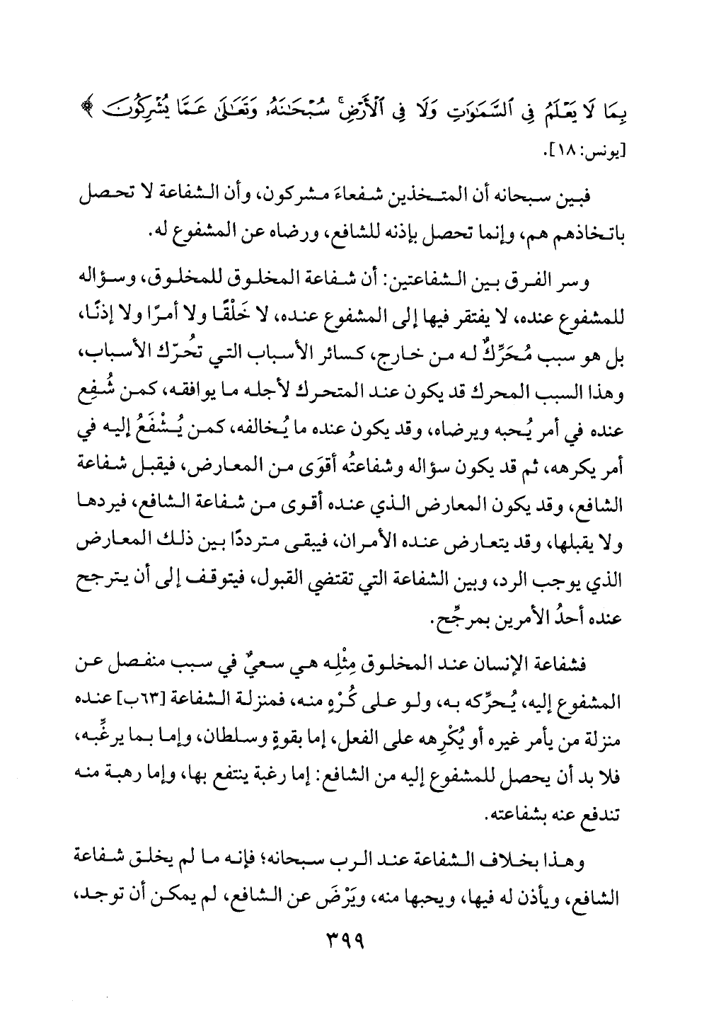 وهذا بخلاف الشفاعة عند الرب سبحانه؛ فإنه ما لم يخلق شفاعة الشافع، ويأذن له فيها، ويحبها منه، ويَرْضَ عن الشافع، لم يمكن أن توجد،