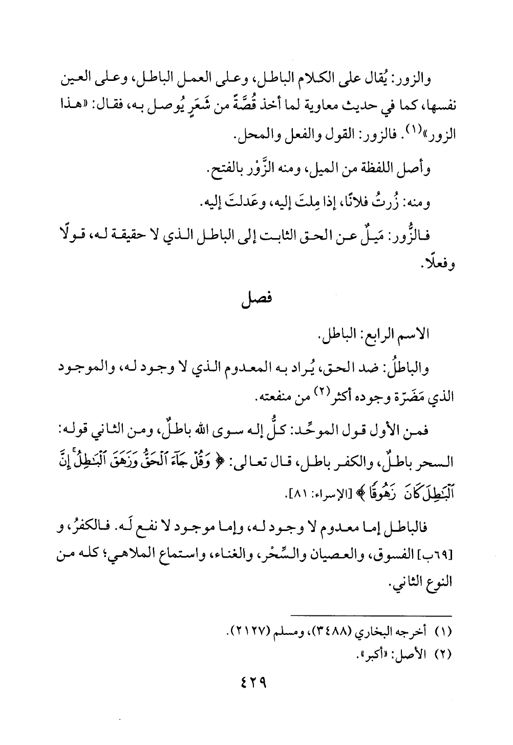 والباطلُ: ضد الحق، يُراد به المعدوم الذي لا وجود له، والموجود الذي مَضَرّة وجوده أكثر (¬2) من منفعته.