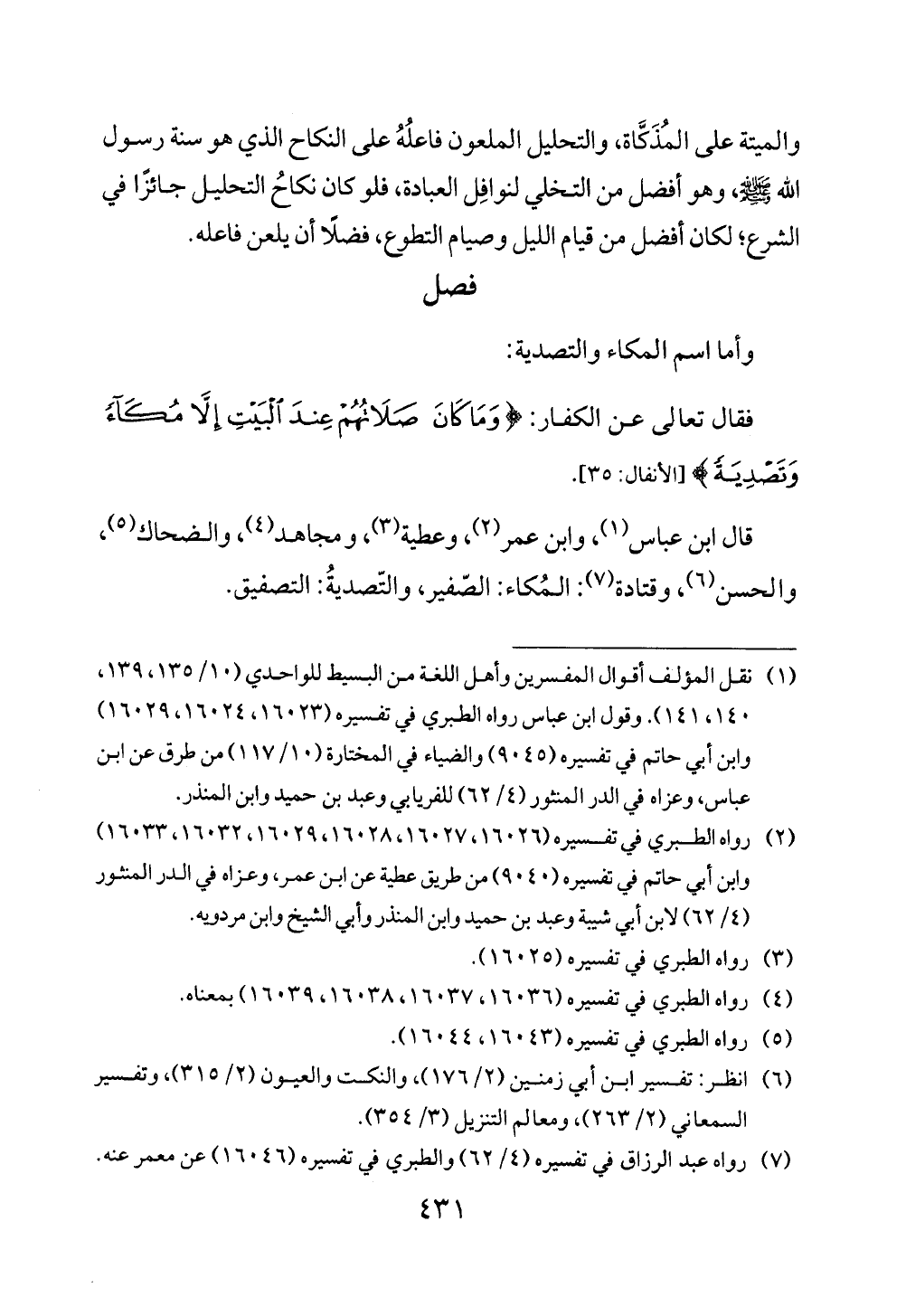 قال ابن عباس (¬1)، وابن عمر (¬2)، وعطية (¬3)، ومجاهد (¬4)، والضحاك (¬5)، والحسن (¬6)، وقتادة (¬7): المُكاء: الصّفير، والتّصديةُ: التصفيق.