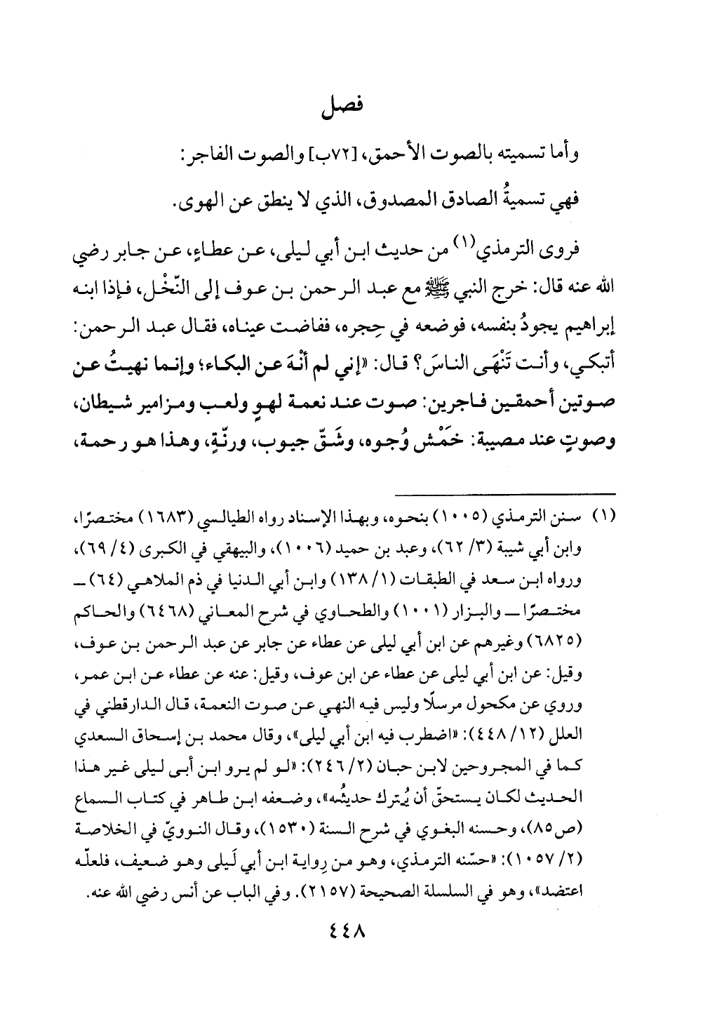 فروى الترمذي (¬1) من حديث ابن أبي ليلى، عن عطاءٍ، عن جابر رضي الله عنه قال: خرج النبي - صلى الله عليه وسلم - مع عبد الرحمن بن عوف إلى النّخْل، فإذا ابنه إبراهيم يجودُ بنفسه، فوضعه في حِجره، ففاضت عيناه، فقال عبد الرحمن: أتبكي، وأنت تَنْهَى الناسَ؟ قال: "إني لم أنْهَ عن البكاء؛ وإنما نهيتُ عن صوتين أحمقين فاجرين: صوت عند نعمة لهوٍ ولعب ومزامير شيطان، وصوتٍ عند مصيبة: خَمْش وُجوه، وشَقّ جيوب، ورنّةٍ، وهذا هو رحمة،