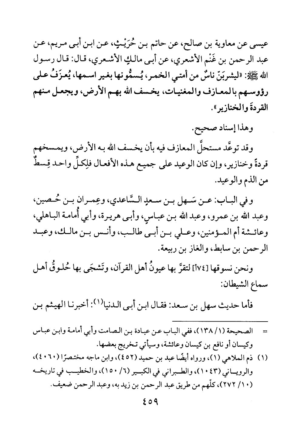 عيسى عن معاوية بن صالح، عن حاتم بن حُرَيْثٍ، عن ابن أبى مريم، عن عبد الرحمن بن غَنْم الأشعري، عن أبى مالكٍ الأشعري، قال: قال رسول الله - صلى الله عليه وسلم -: "ليشربَنّ ناسٌ من أمتي الخمر، يُسمُّونها بغير اسمها، يُعزَفُ على رؤوسهم بالمعازف والمغنيات، يخسف الله بهم الأرض، ويجعل منهم القردةَ والخنازير".