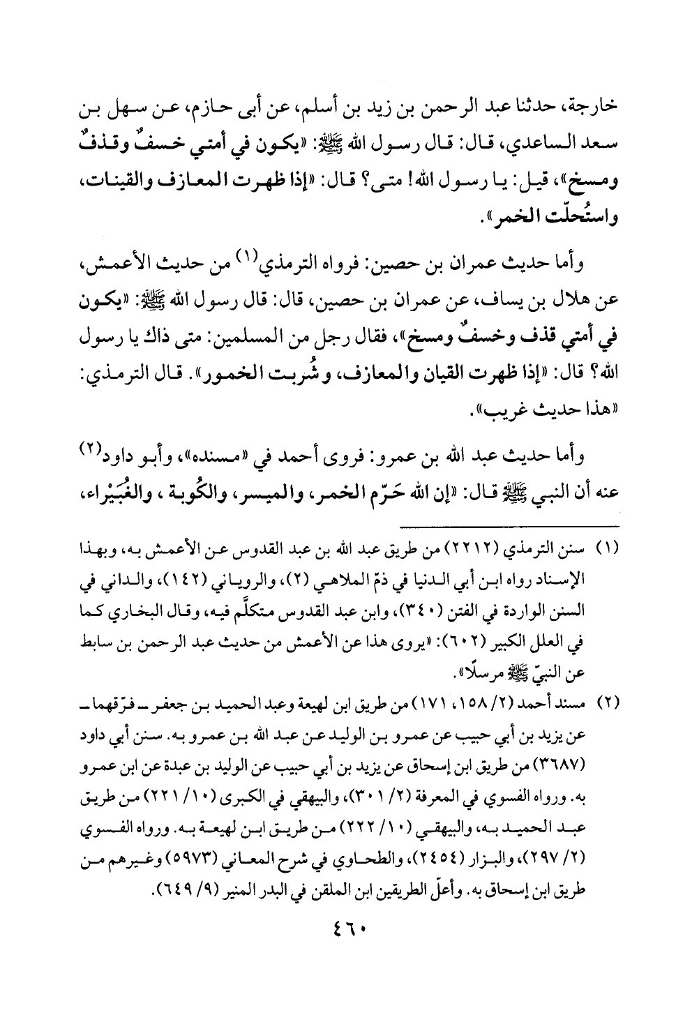 خارجة، حدثنا عبد الرحمن بن زيد بن أسلم، عن أبى حازم، عن سهل بن سعد الساعدي، قال: قال رسول الله - صلى الله عليه وسلم -: "يكون في أمتي خسفٌ وقذفٌ ومسخ"، قيل: يا رسول الله! متى؟ قال: "إذا ظهرت المعازف والقينات، واستُحلّت الخمر".