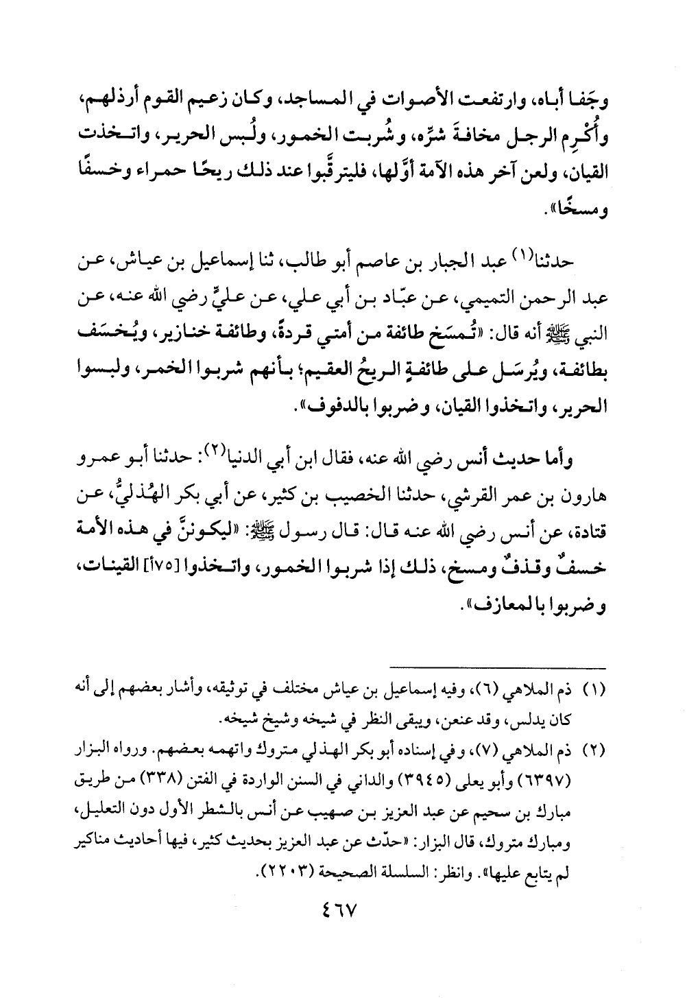 حدثنا (¬1) عبد الجبار بن عاصم أبو طالب، ثنا إسماعيل بن عياش، عن عبد الرحمن التميمي، عن عبّاد بن أبي علي، عن عليٍّ رضي الله عنه، عن النبي - صلى الله عليه وسلم - أنه قال: "تُمسَخ طائفة من أمتي قردةً، وطائفة خنازير، ويُخسَف بطائفة، ويُرسَل على طائفةٍ الريحُ العقيم؛ بأنهم شربوا الخمر، ولبسوا الحرير، واتخذوا القيان، وضربوا بالدفوف".