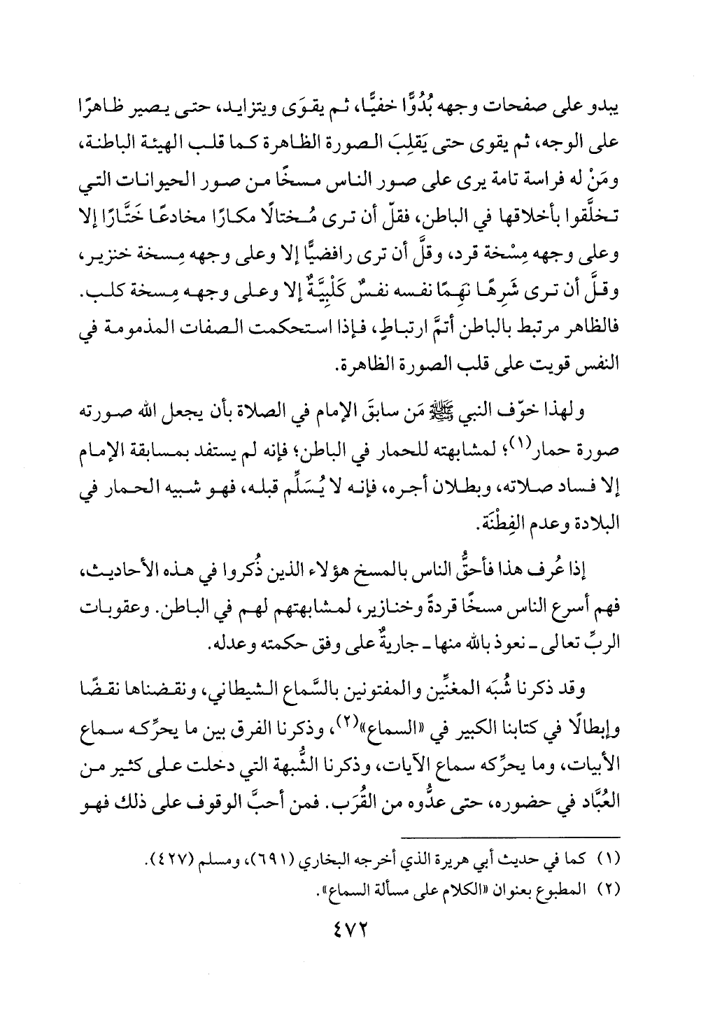 ولهذا خوّف النبي - صلى الله عليه وسلم - مَن سابقَ الإمام في الصلاة بأن يجعل الله صورته صورة حمار (¬1)؛ لمشابهته للحمار في الباطن؛ فإنه لم يستفد بمسابقة الإمام إلا فساد صلاته، وبطلان أجره، فإنه لا يُسَلِّم قبله، فهو شبيه الحمار في البلادة وعدم الفِطْنَة.