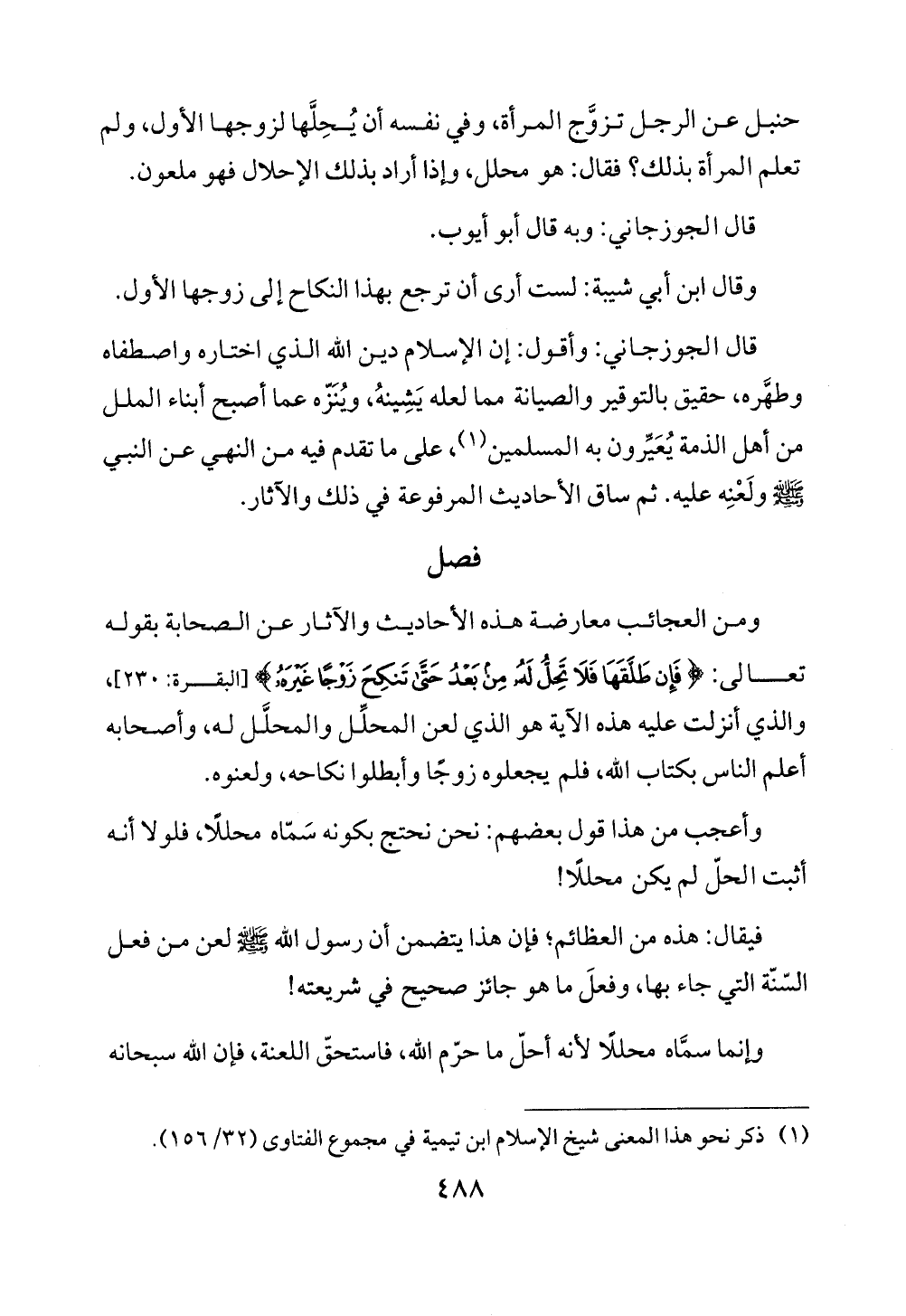 ومن العجائب معارضة هذه الأحاديث والآثار عن الصحابة بقوله تعالى: {فَإِنْ طَلَّقَهَا فَلَا تَحِلُّ لَهُ مِنْ بَعْدُ حَتَّى تَنْكِحَ زَوْجًا غَيْرَهُ} [البقرة: 230]، والذي أنزلت عليه هذه الآية هو الذي لعن المحلِّل والمحلَّل له، وأصحابه أعلم الناس بكتاب الله، فلم يجعلوه زوجًا وأبطلوا نكاحه، ولعنوه.