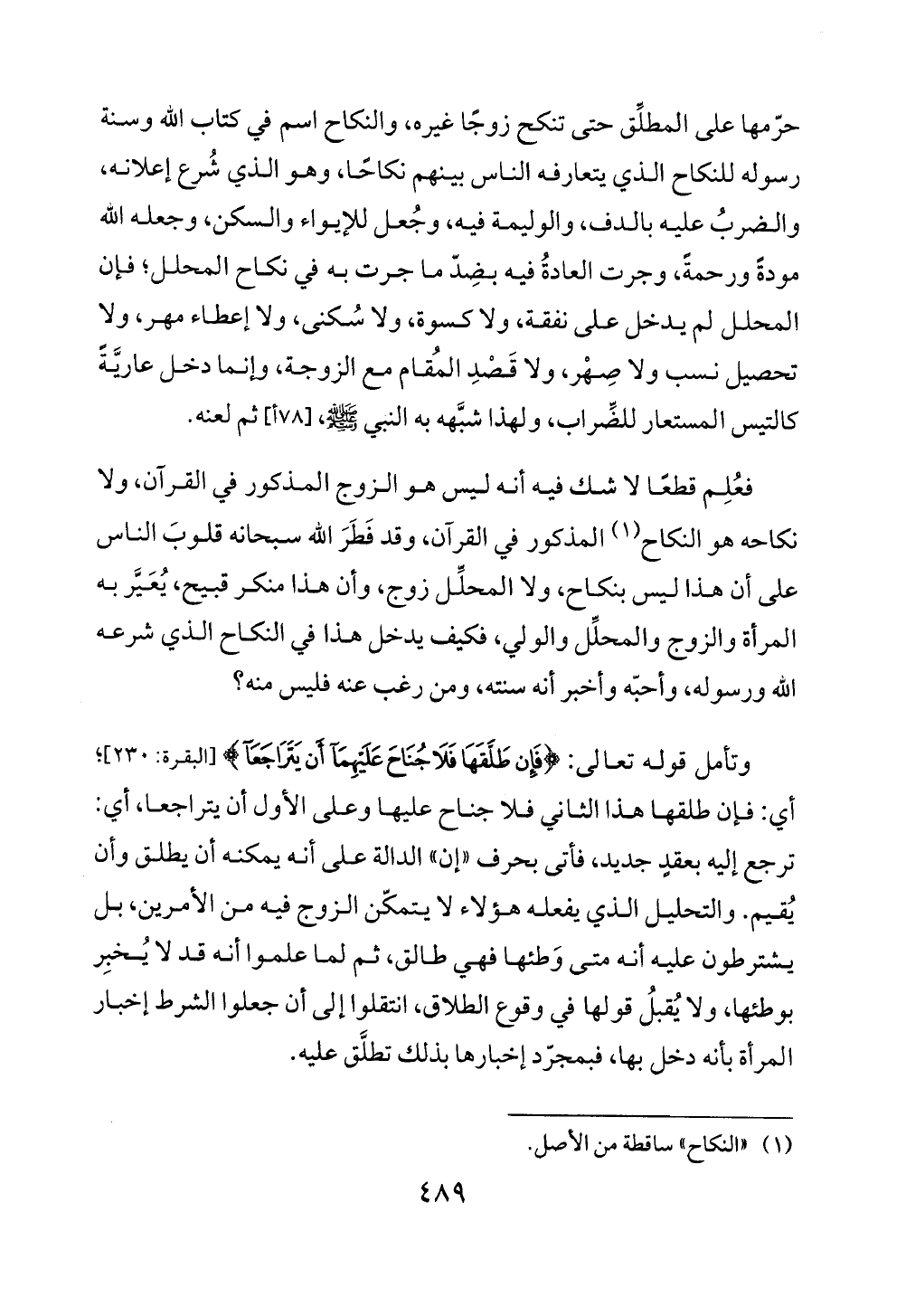 وتأمل قوله تعالى: {فَإِنْ طَلَّقَهَا فَلَا جُنَاحَ عَلَيْهِمَا أَنْ يَتَرَاجَعَا} [البقرة: 230]؛ أي: فإن طلقها هذا الثاني فلا جناح عليها وعلى الأول أن يتراجعا، أي: ترجع إليه بعقدٍ جديد، فأتى بحرف "إن" الدالة على أنه يمكنه أن يطلق وأن يُقيم. والتحليل الذي يفعله هؤلاء لا يتمكّن الزوج فيه من الأمرين، بل يشترطون عليه أنه متى وَطئها فهي طالق، ثم لما علموا أنه قد لا يُخبِر بوطئها، ولا يُقبلُ قولها في وقوع الطلاق، انتقلوا إلى أن جعلوا الشرط إخبار المرأة بأنه دخل بها، فبمجرّد إخبارها بذلك تطلَّق عليه.