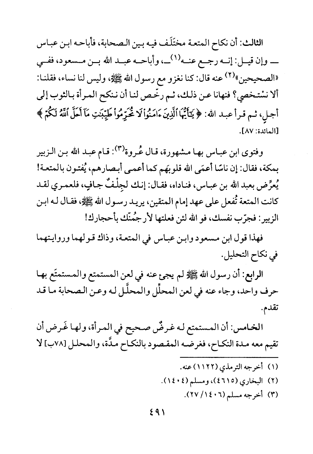الثالث: أن نكاح المتعة مختَلَف فيه بين الصحابة، فأباحه ابن عباس - وإن قيل: إنه رجع عنه (¬1) -، وأباحه عبد الله بن مسعود، ففي "الصحيحين" (¬2) عنه قال: كنا نغزو مع رسول الله - صلى الله عليه وسلم -، وليس لنا نساء، فقلنا: ألا نسْتخصي؟ فنهانا عن ذلك، ثم رخّص لنا أن ننكح المرأة بالثوب إلى أجلٍ، ثم قرأ عبد الله: {يَاأَيُّهَا الَّذِينَ آمَنُوا لَا تُحَرِّمُوا طَيِّبَاتِ مَا أَحَلَّ اللَّهُ لَكُمْ} [المائدة: 87].