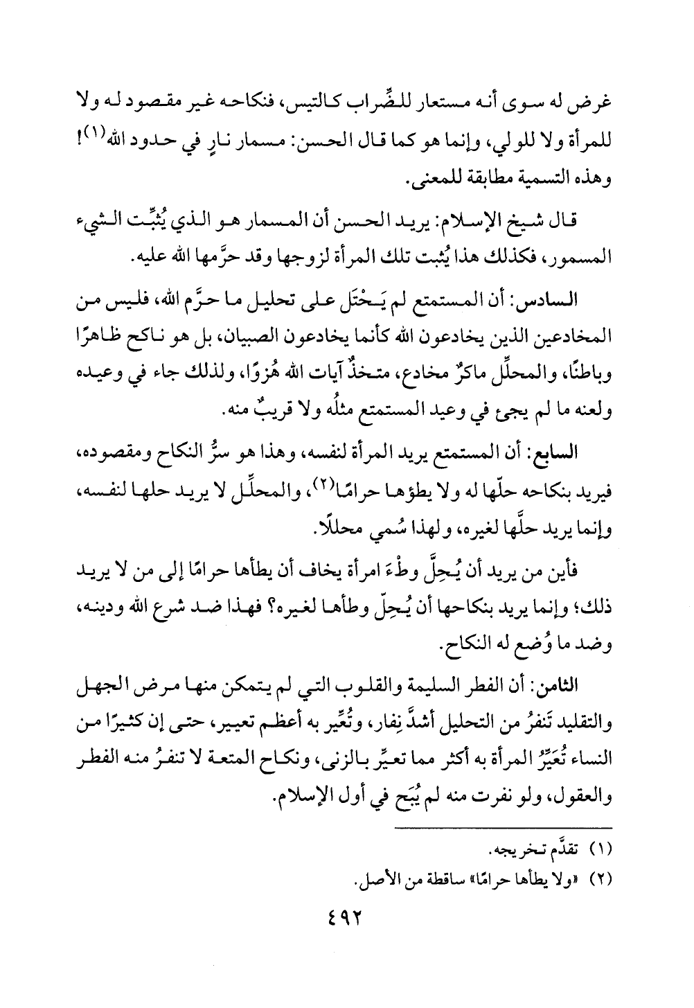 الثامن: أن الفطر السليمة والقلوب التي لم يتمكن منها مرض الجهل والتقليد تَنفرُ من التحليل أشدَّ نِفار، وتُعِّير به أعظم تعيير، حتى إن كثيرًا من النساء تُعَيِّرُ المرأة به أكثر مما تعيِّر بالزنى، ونكاح المتعة لا تنفرُ منه الفطر والعقول، ولو نفرت منه لم يُبَح في أول الإسلام.