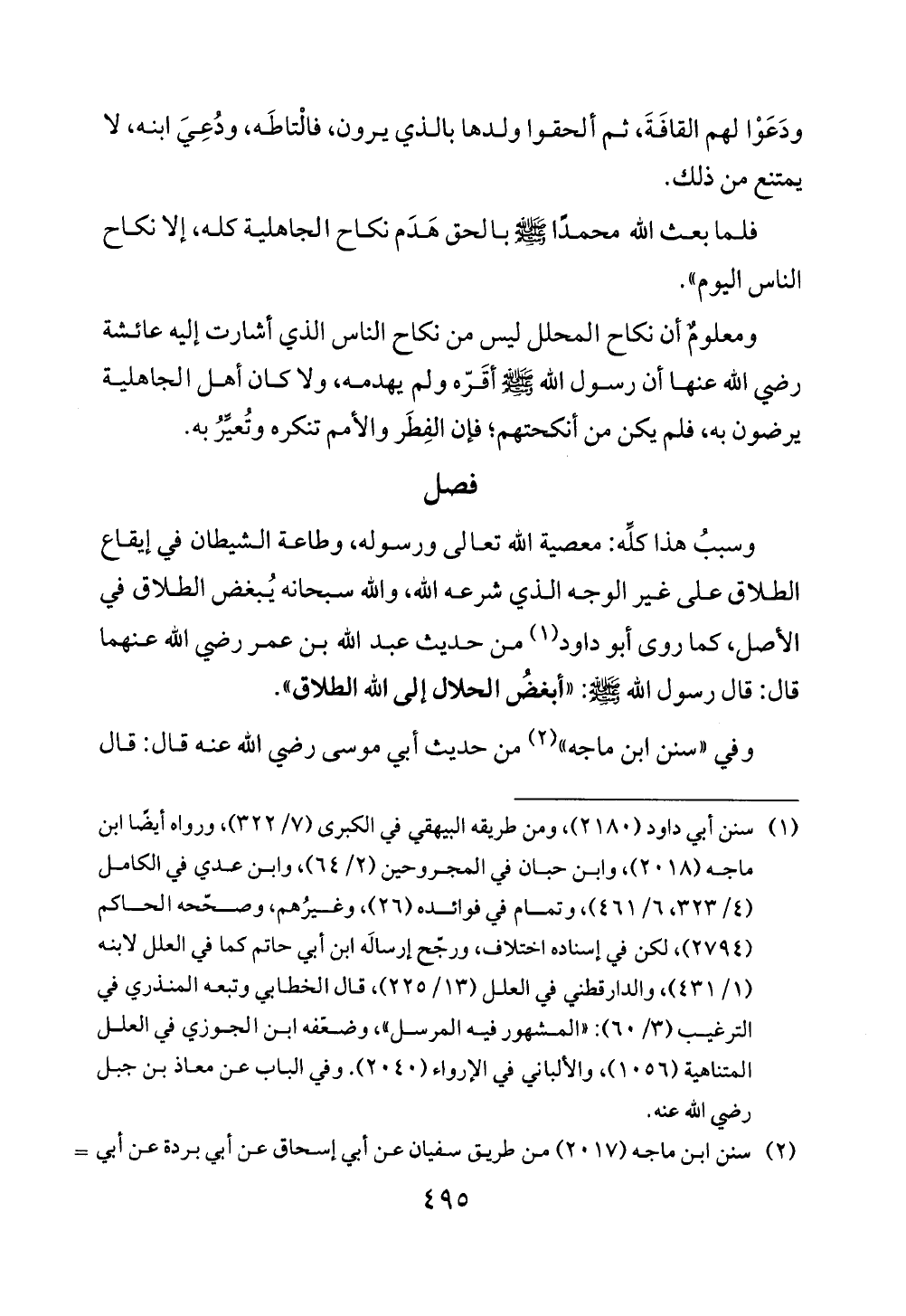 وسببُ هذا كلَّه: معصية الله تعالى ورسوله، وطاعة الشيطان في إيقاع الطلاق على غير الوجه الذي شرعه الله، والله سبحانه يُبغض الطلاق في الأصل، كما روى أبو داود (¬1) من حديث عبد الله بن عمر رضي الله عنهما قال: قال رسول الله - صلى الله عليه وسلم -: "أبغضُ الحلال إلى الله الطلاق".